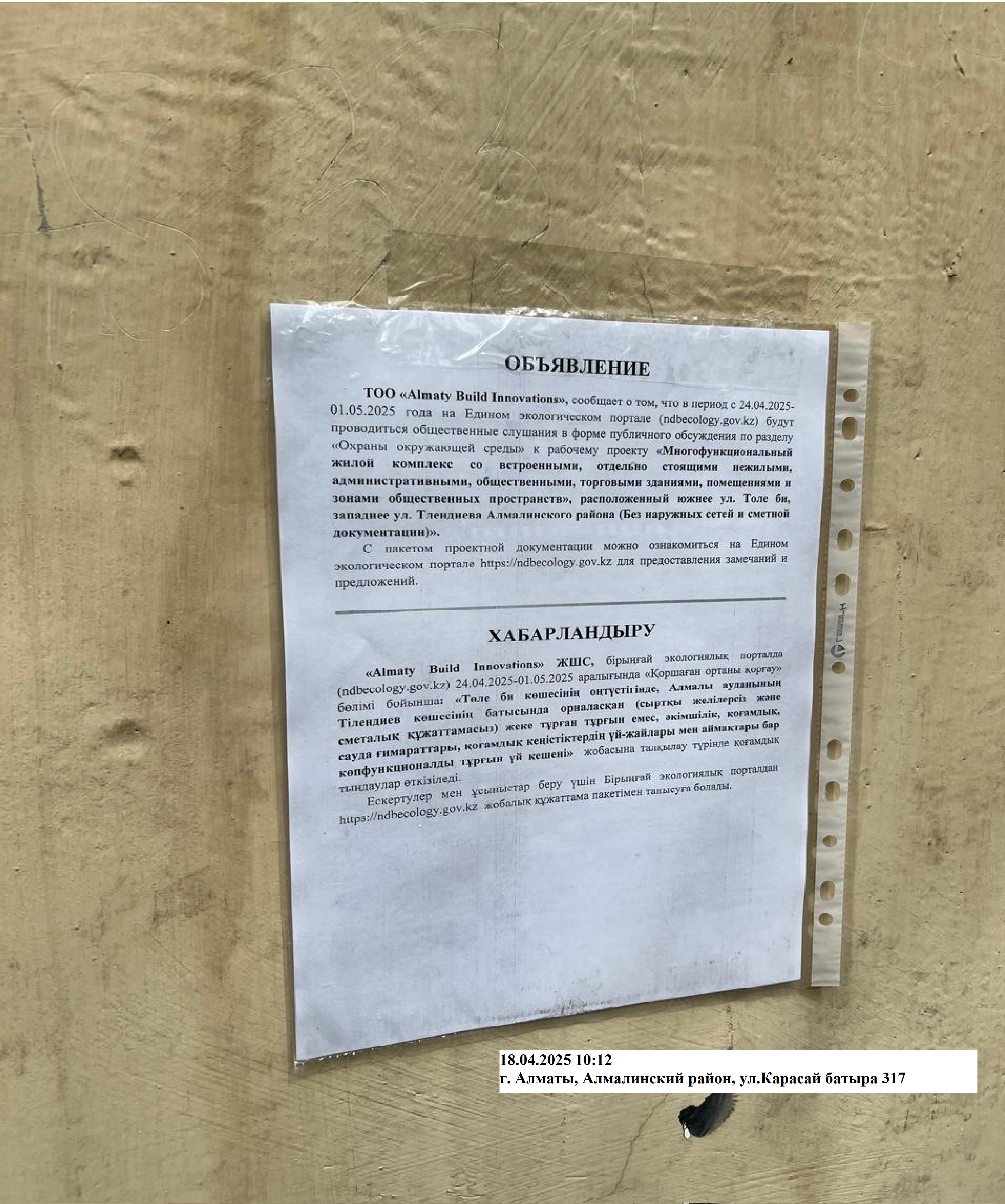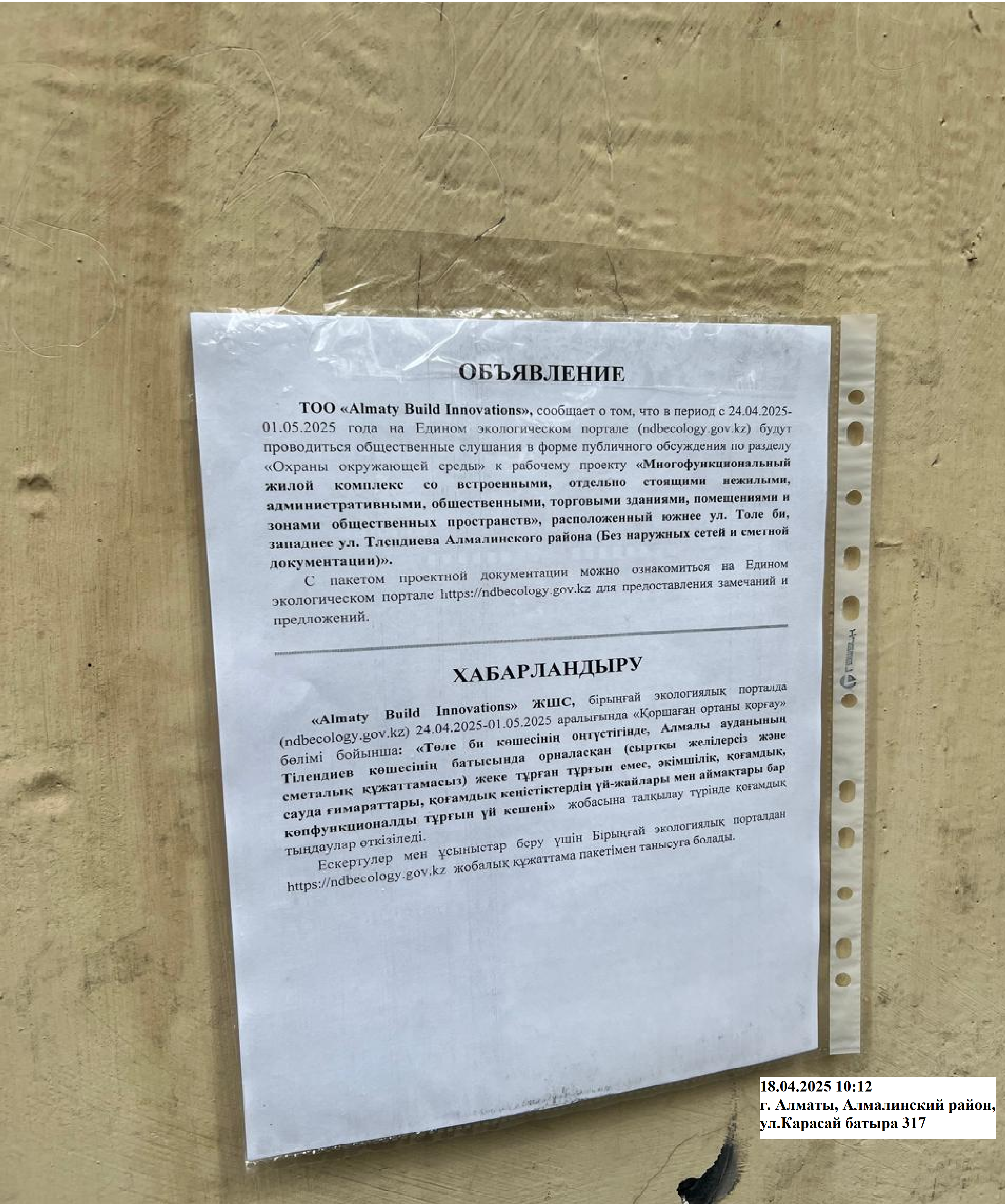 По проекту: Раздел «Охрана окружающей среды» к рабочему проекту «Многофункциональный жилой комплекс со встроенными, отдельно стоящими нежилыми, административными, общественными, торговыми зданиями, помещениями и зонами общественных пространств», расположенный южнее ул. Толе би, западнее ул. Тлендиева Алмалинского района (Без наружных сетей и сметной документации)».