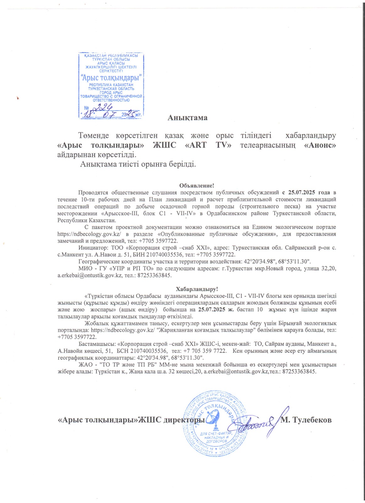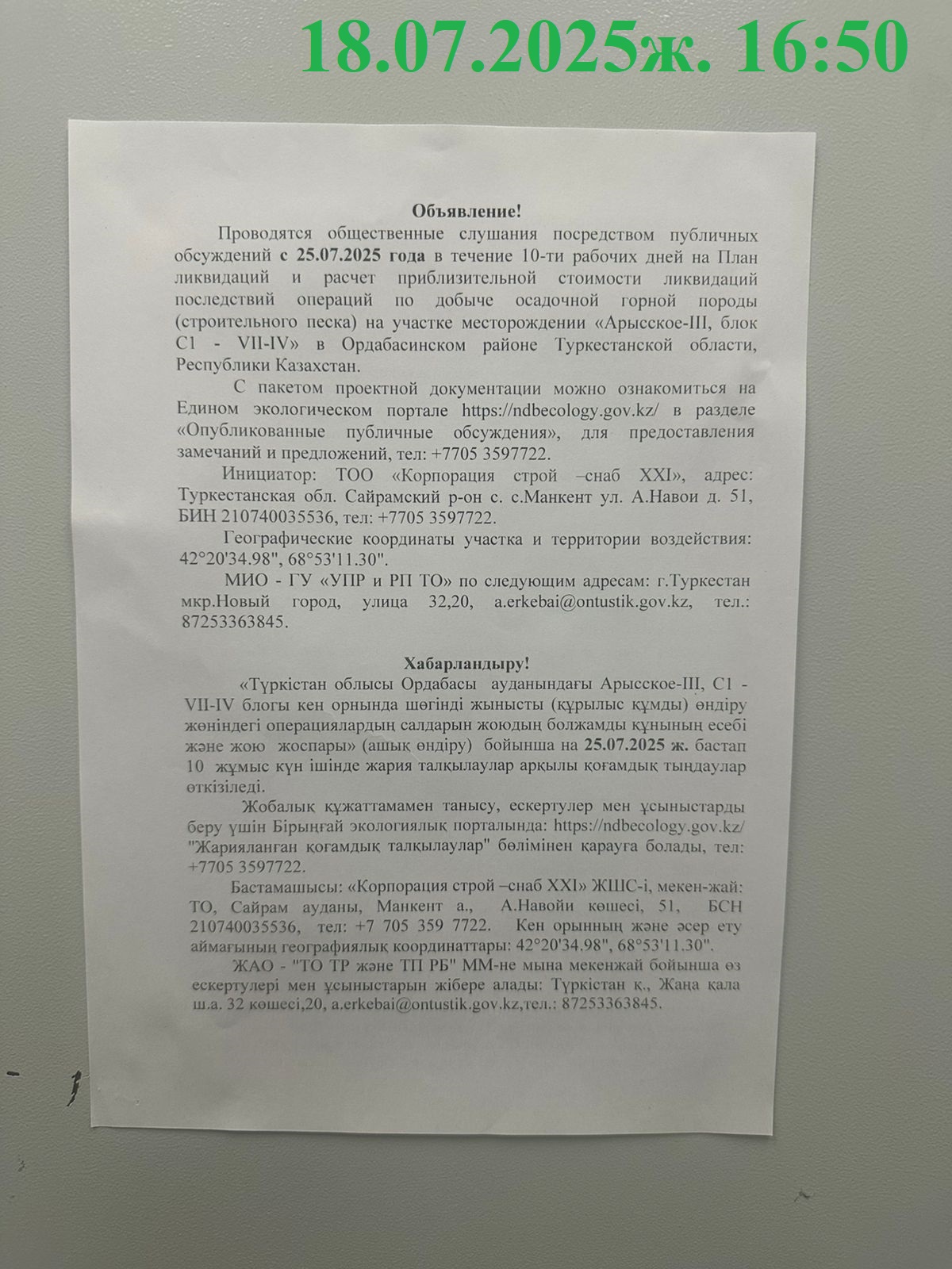 По проекту: План ликвидаций и расчет приблизительной стоимости ликвидаций последствий операций по добыче осадочной горной породы (строительного песка) на участке месторождении «Арысское-III, блок C1 - VII-IV» в Ордабасинском районе Туркестанской области, Республики Казахстан