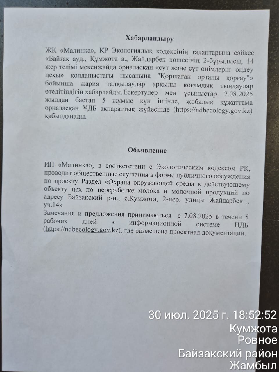 По проекту: Раздел «Охрана окружающей среды» к действующему объекту «цех по переработке молока и молочных продуктов ИП «Малинка» расположенной пол адресу: Жамбылская область, Байзакский район, с.Кумжота, пер.Жайдарбек 2, участок №14