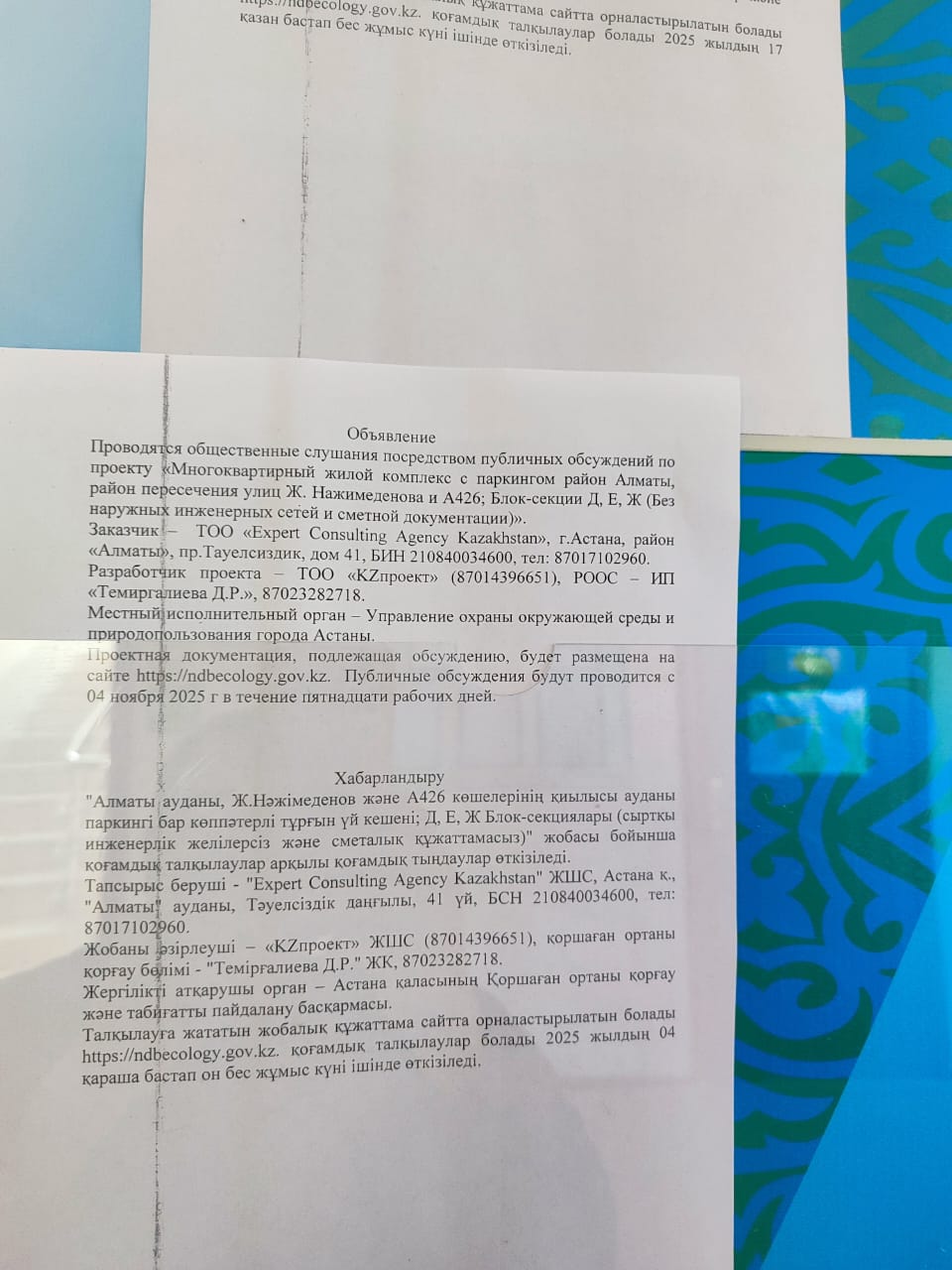 По проекту: «Многоквартирный жилой комплекс с паркингом район Алматы, район пересечения улиц Ж. Нажимеденова и А426; Блок-секции Д, Е, Ж (Без наружных инженерных сетей и сметной документации)»