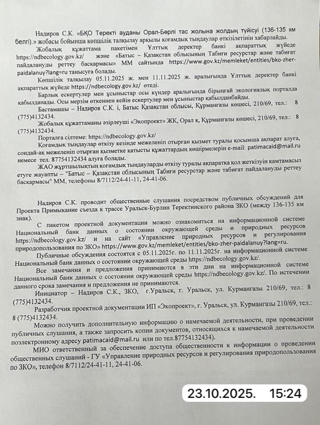 По проекту: Проект "ПРИМЫКАНИЕ СЪЕЗДА К ТРАССЕ УРАЛЬСК - БУРЛИН ТЕРЕКТИНСКОГО РАЙОНА ЗКО (МЕЖДУ 136-135км знак)"