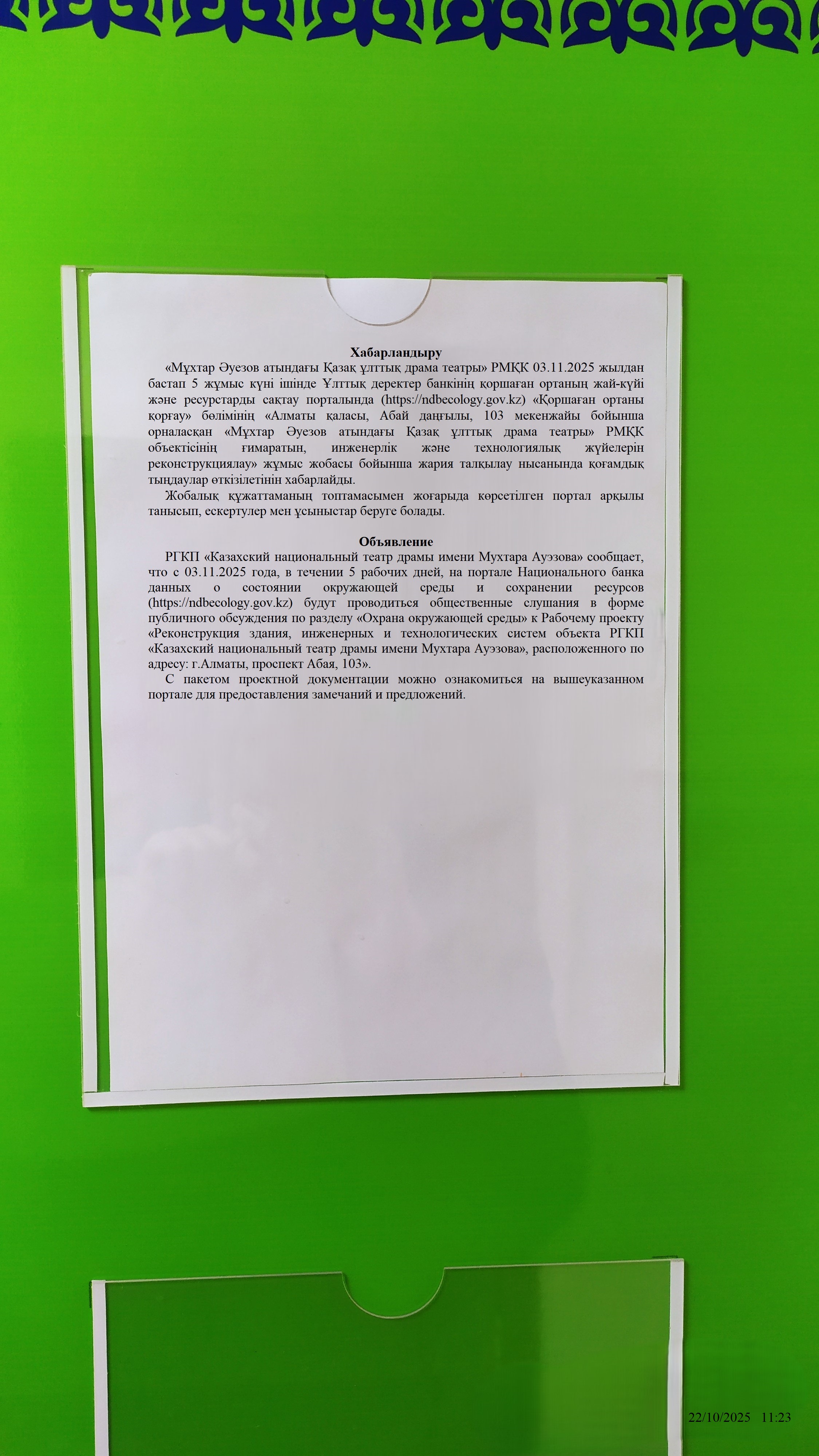 По проекту: Проект "Охрана окружающей среды" для объекта "Реконструкция здания, инженерных и технологических систем объекта РГКП «Казахский национальный театр драмы имени Мухтара Ауэзова», расположенного по адресу: г.Алматы, проспект Абая, 103"