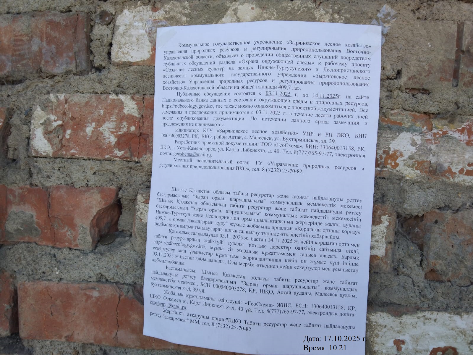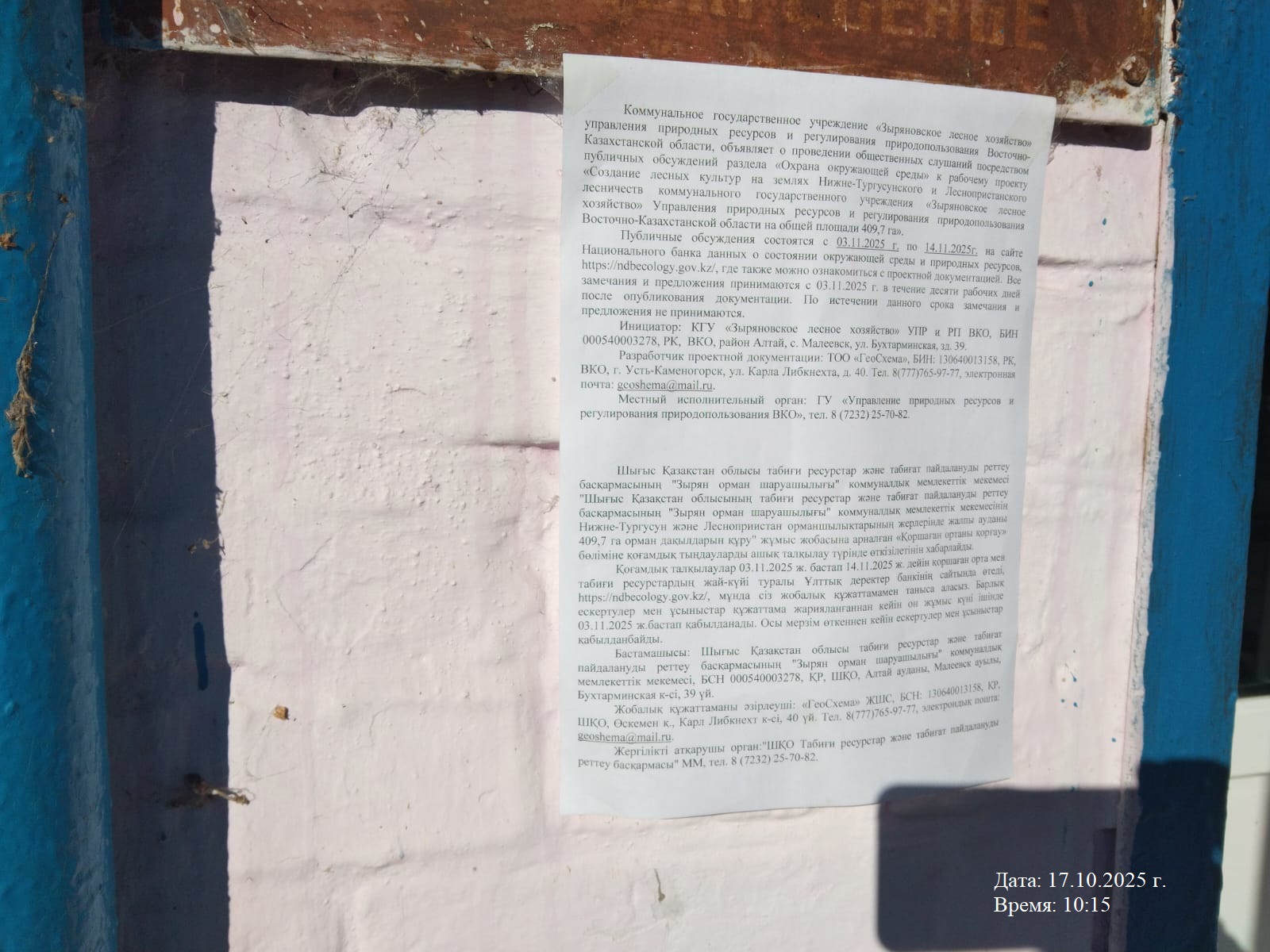 По проекту: «Создание лесных культур на землях Нижне-Тургусунского и Леснопристанского лесничеств коммунального государственного учреждения «Зыряновское лесное хозяйство» Управления природных ресурсов и регулирования природопользования Восточно-Казахстанской области на общей площади 409,7 га»