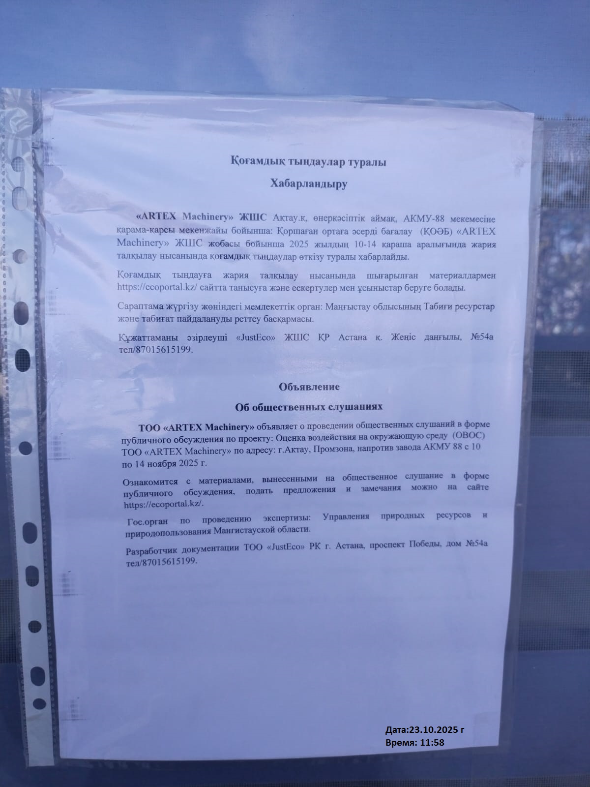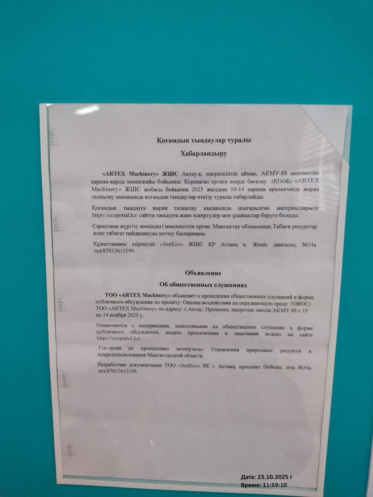 По проекту: Оценка воздействия на окружающую среду (ОВОС) ТОО «ARTEX Machinery».