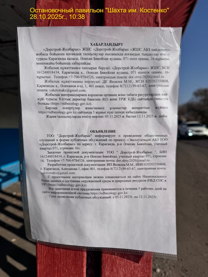 По проекту: Эксплуатация АБЗ ТОО «Дорстрой-Жолбарыс» по адресу: г. Караганда, р-н Әлихан Бөкейхан, учетный квартал 071, строение 16