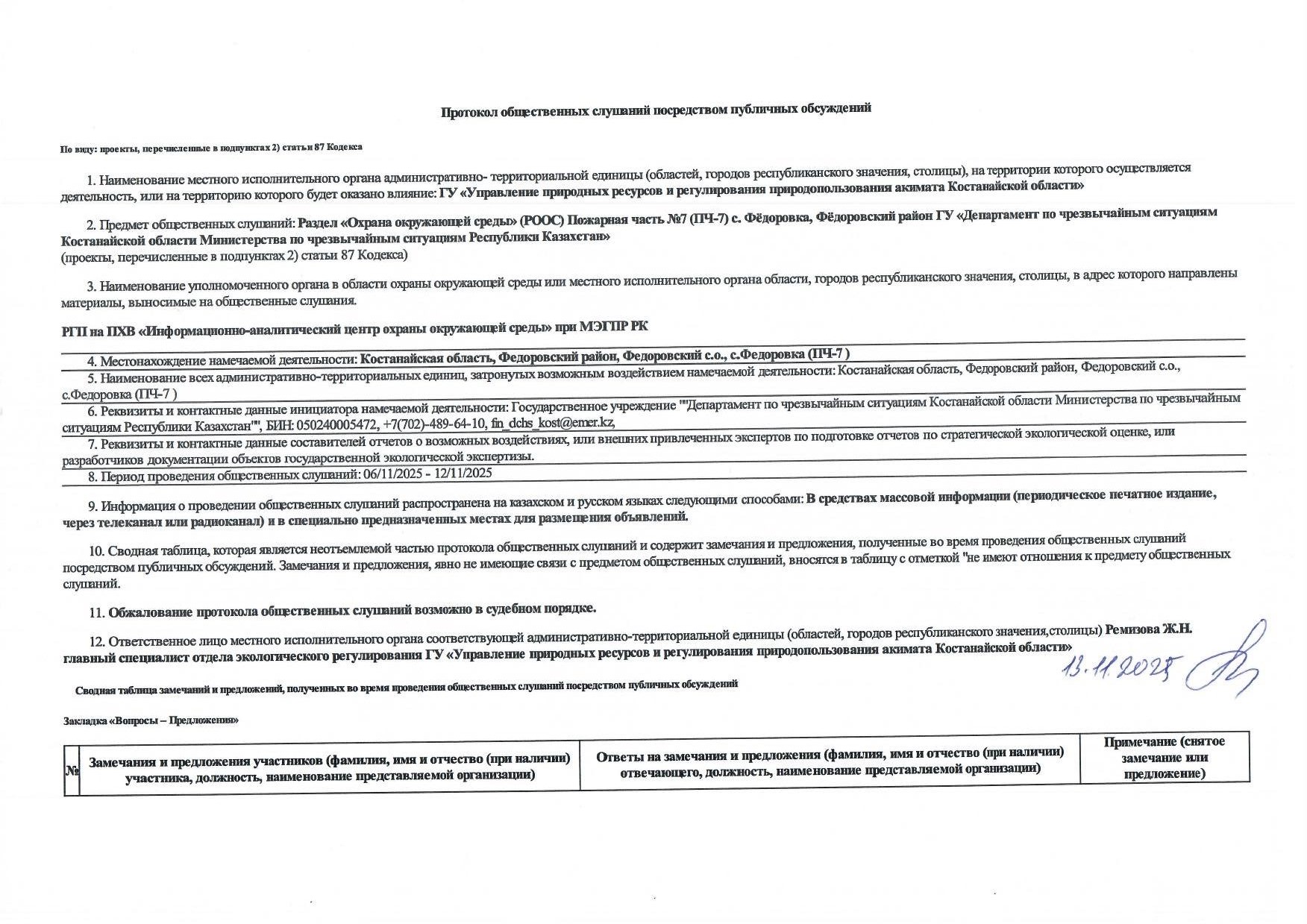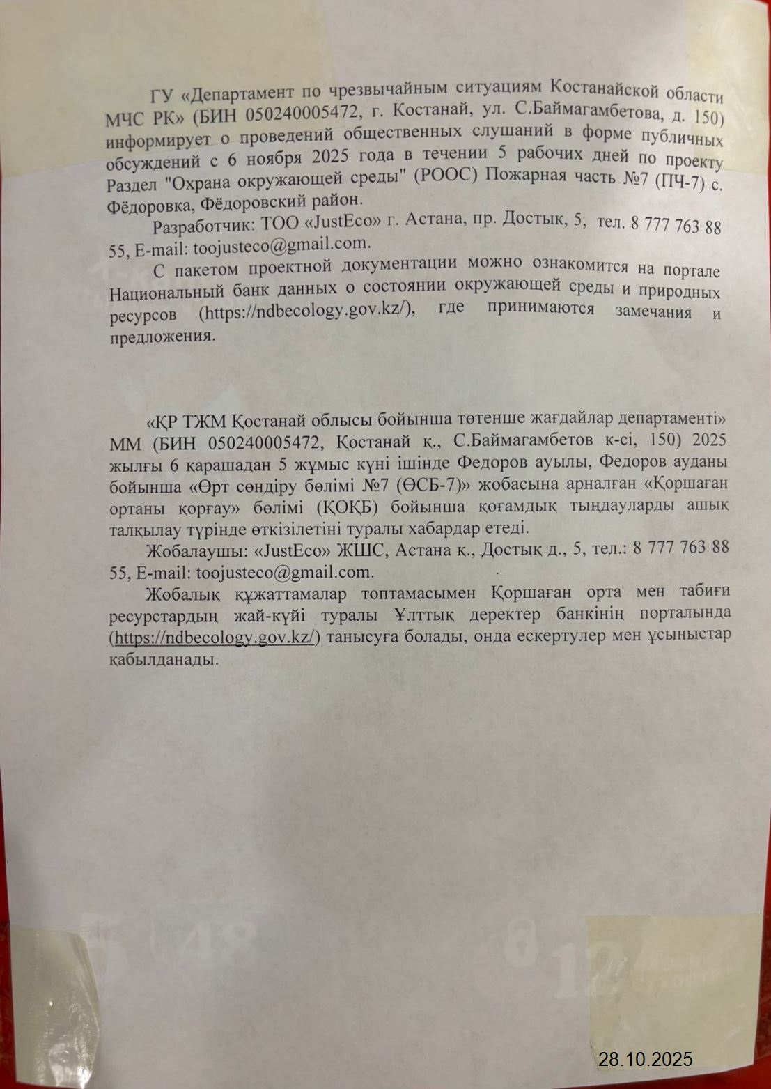 По проекту: Раздел «Охрана окружающей среды» (РООС) Пожарная часть №7 (ПЧ-7) с. Фёдоровка, Фёдоровский район ГУ «Департамент по чрезвычайным ситуациям Костанайской области Министерства по чрезвычайным ситуациям Республики Казахстан»
