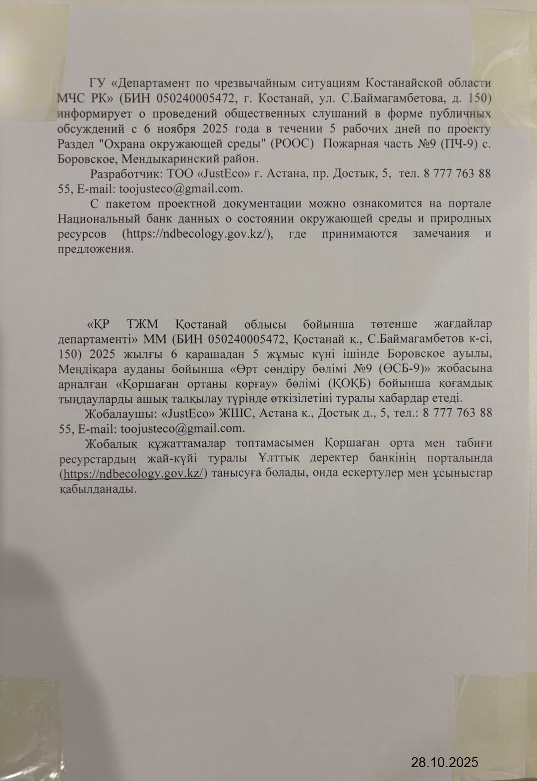 1.3. Контакты:fin_dchs_kost@emer.kz; ;