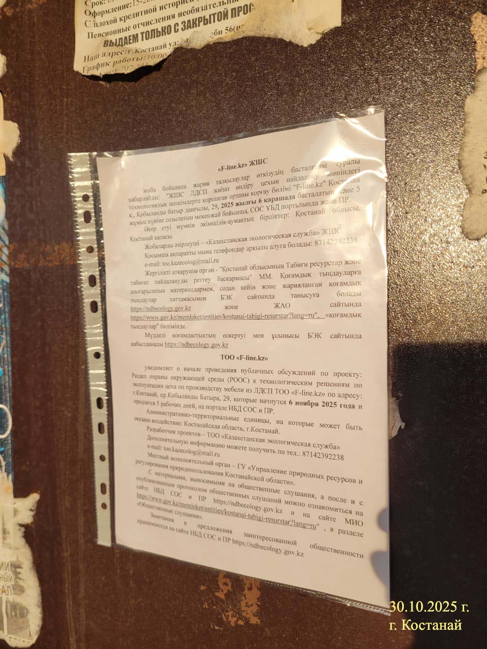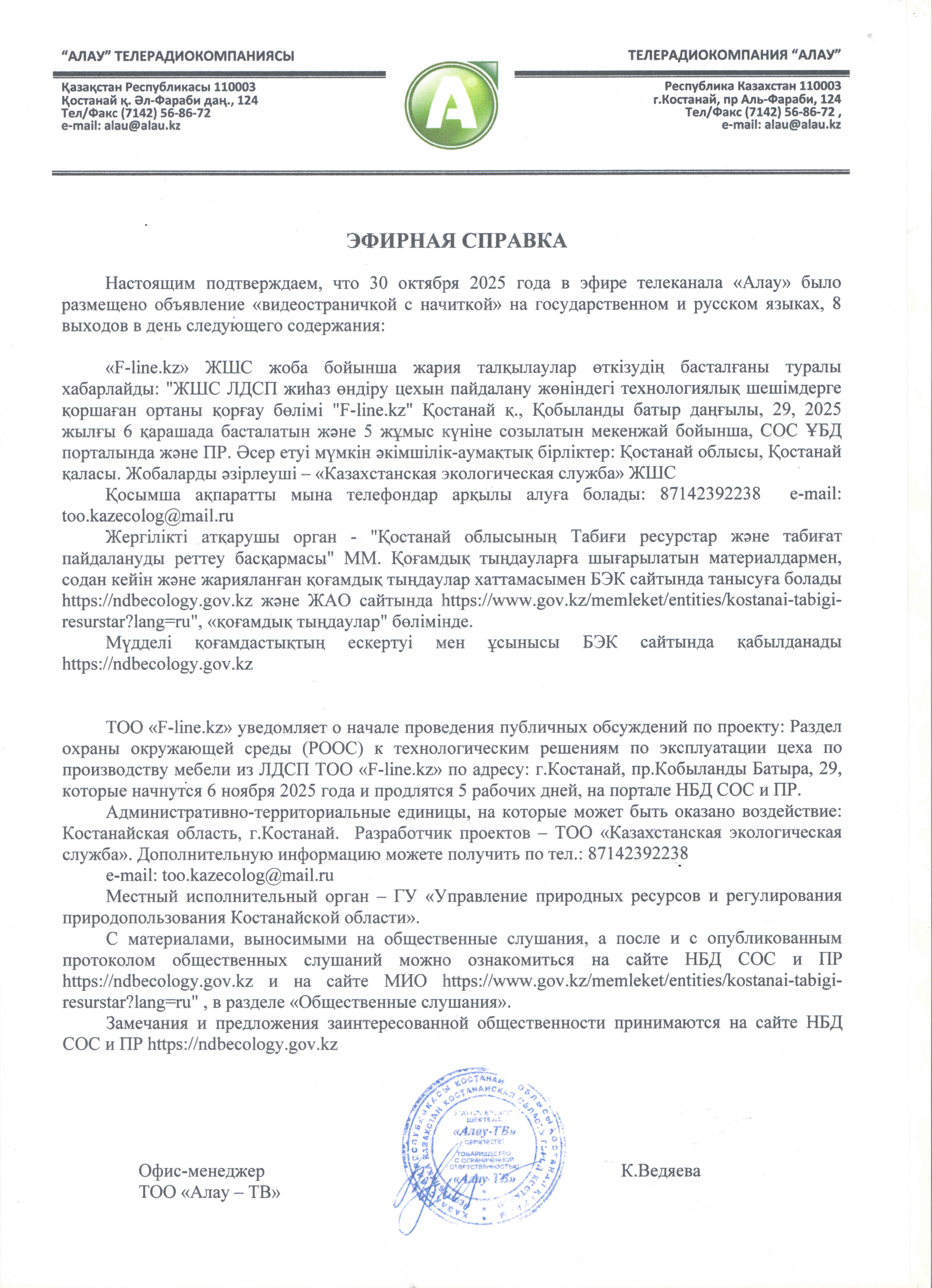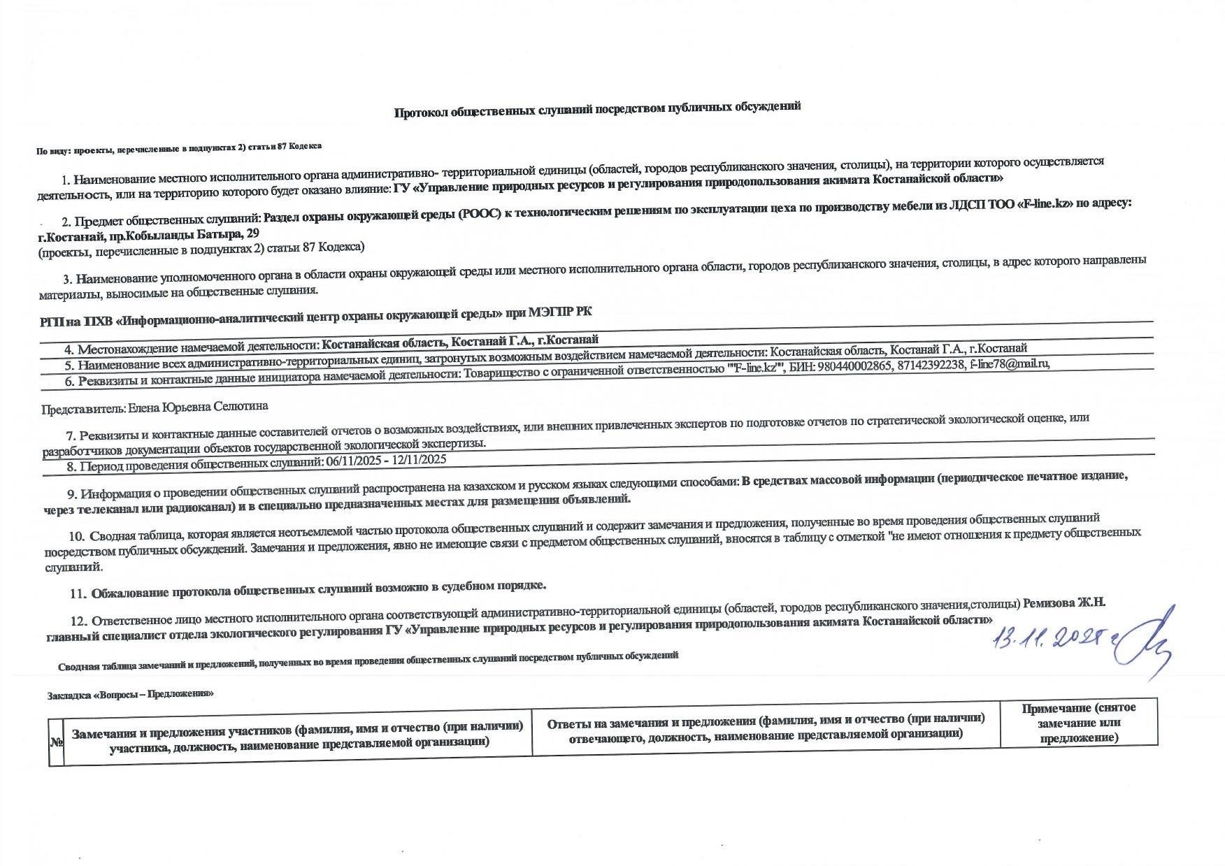 По проекту: Раздел охраны окружающей среды (РООС) к технологическим решениям по эксплуатации цеха по производству мебели из ЛДСП ТОО «F-line.kz» по адресу: г.Костанай, пр.Кобыланды Батыра, 29