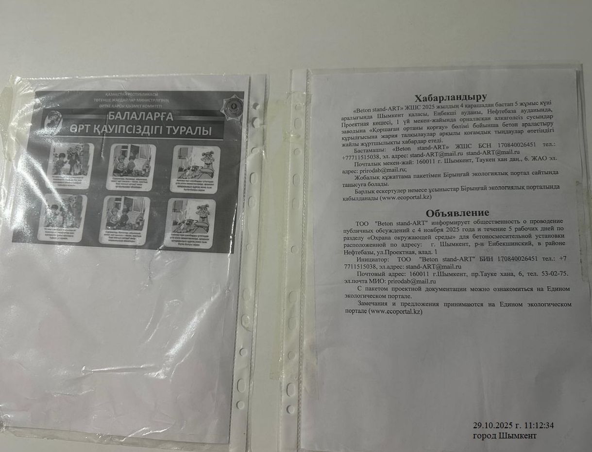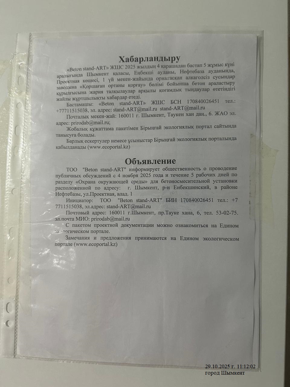 По проекту: РАЗДЕЛ «Охрана окружающей среды» для – Бетоносмесительной установки Товарищество с ограниченной ответственностью "Beton stand-ART" расположенной по адресу: г. Шымкент, р-н Енбекшинский, в районе Нефтебазы, ул.Проектная, влад. 1