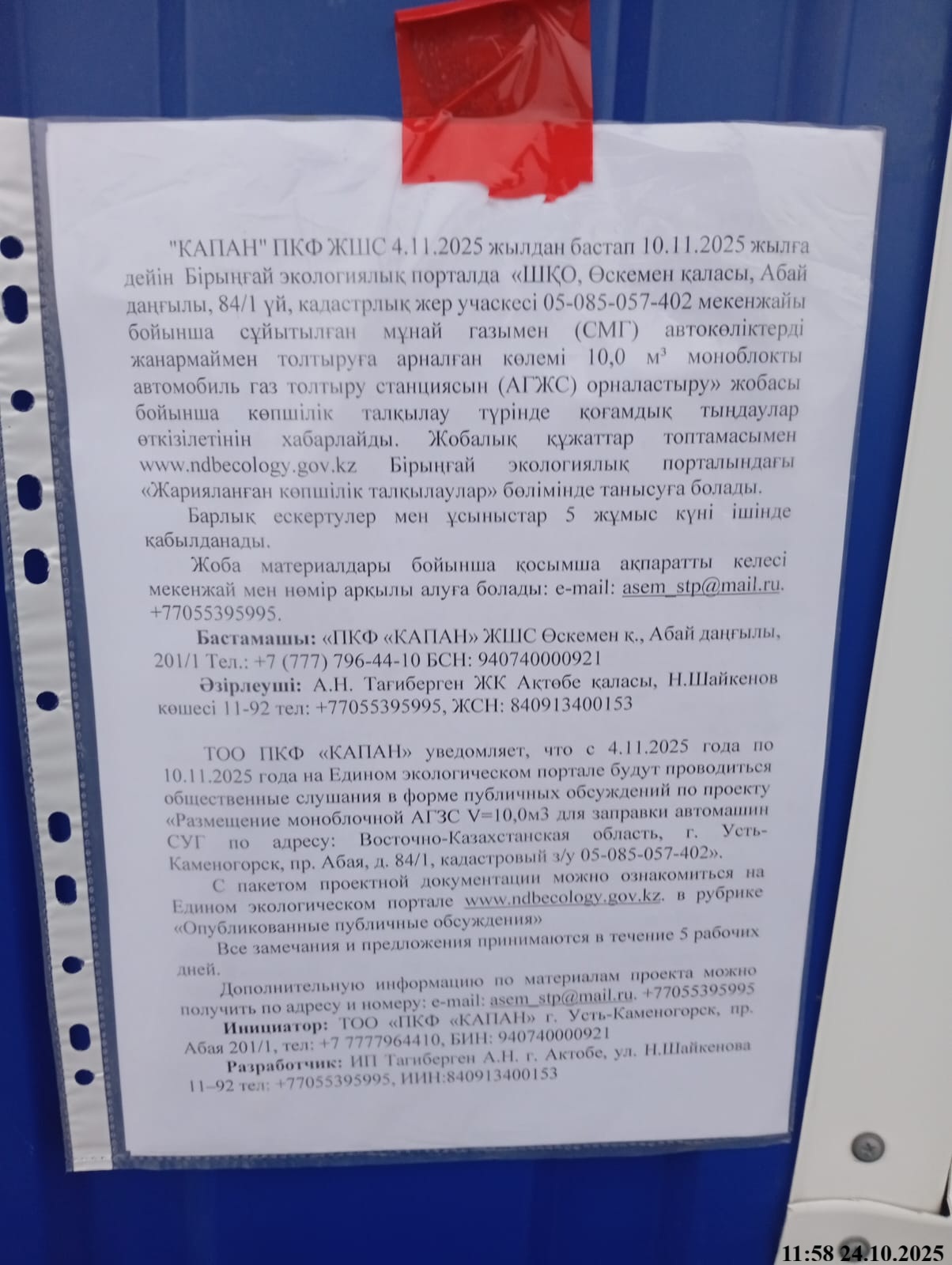 По проекту: Раздел охраны окружающей среды (РООС) для АГЗС «Айт» г. Усть-Каменогорск, п.Ахмирово, ул. г.Аязбаева ¼