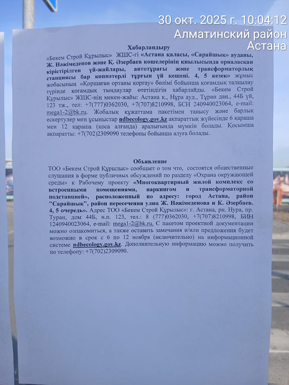По проекту: Проект РООС к рабочему проекту «Многоквартирный жилой комплекс со встроенными помещениями, паркингом и трансформаторной подстанцией», расположенный по адресу: город Астана, район "Сарайшық", район пересечения улиц Ж. Нәжімеденова и К. Әзербаев. 4, 5 очередь».