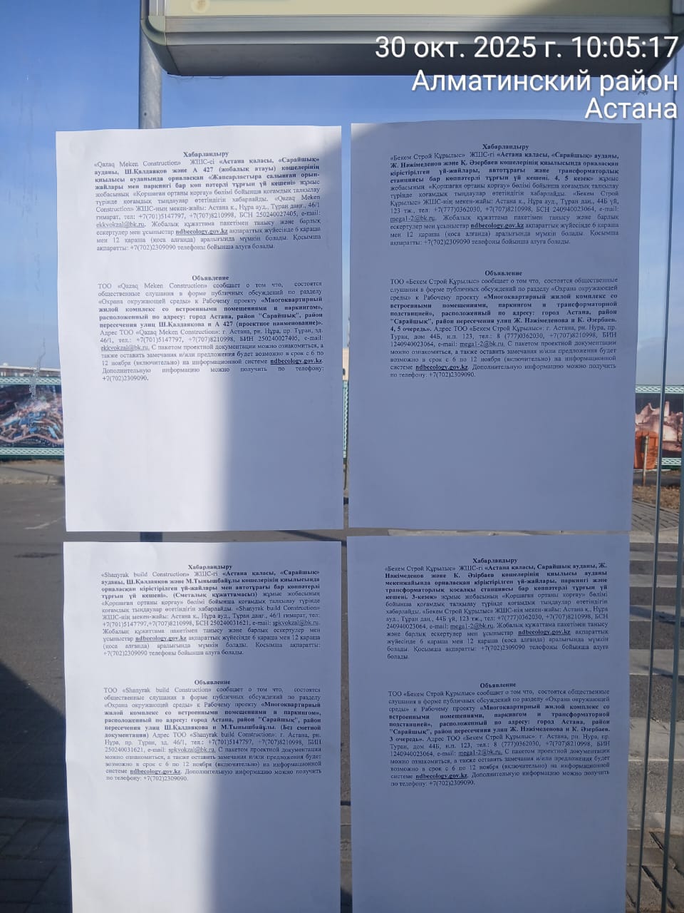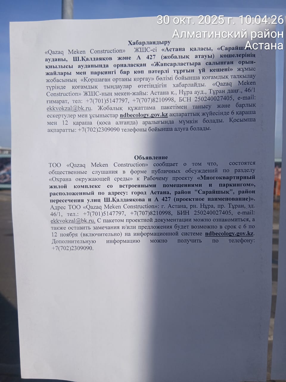 По проекту: Проект РООС к рабочему проекту «Многоквартирный жилой комплекс со встроенными помещениями и паркингом», расположенный по адресу: город Астана, район "Сарайшық", район пересечения улиц Ш.Қалдаяқова и А 427 (проектное наименование)».