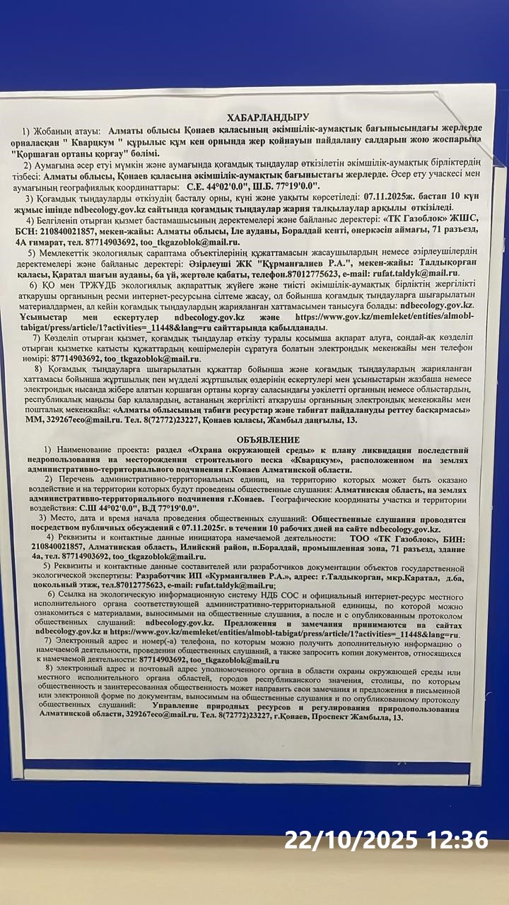 По проекту: План ликвидации последствий недропользования на месторождении строительного песка «Кварцкум», расположенном на землях административно-территориального подчинения г.Конаев Алматинской области