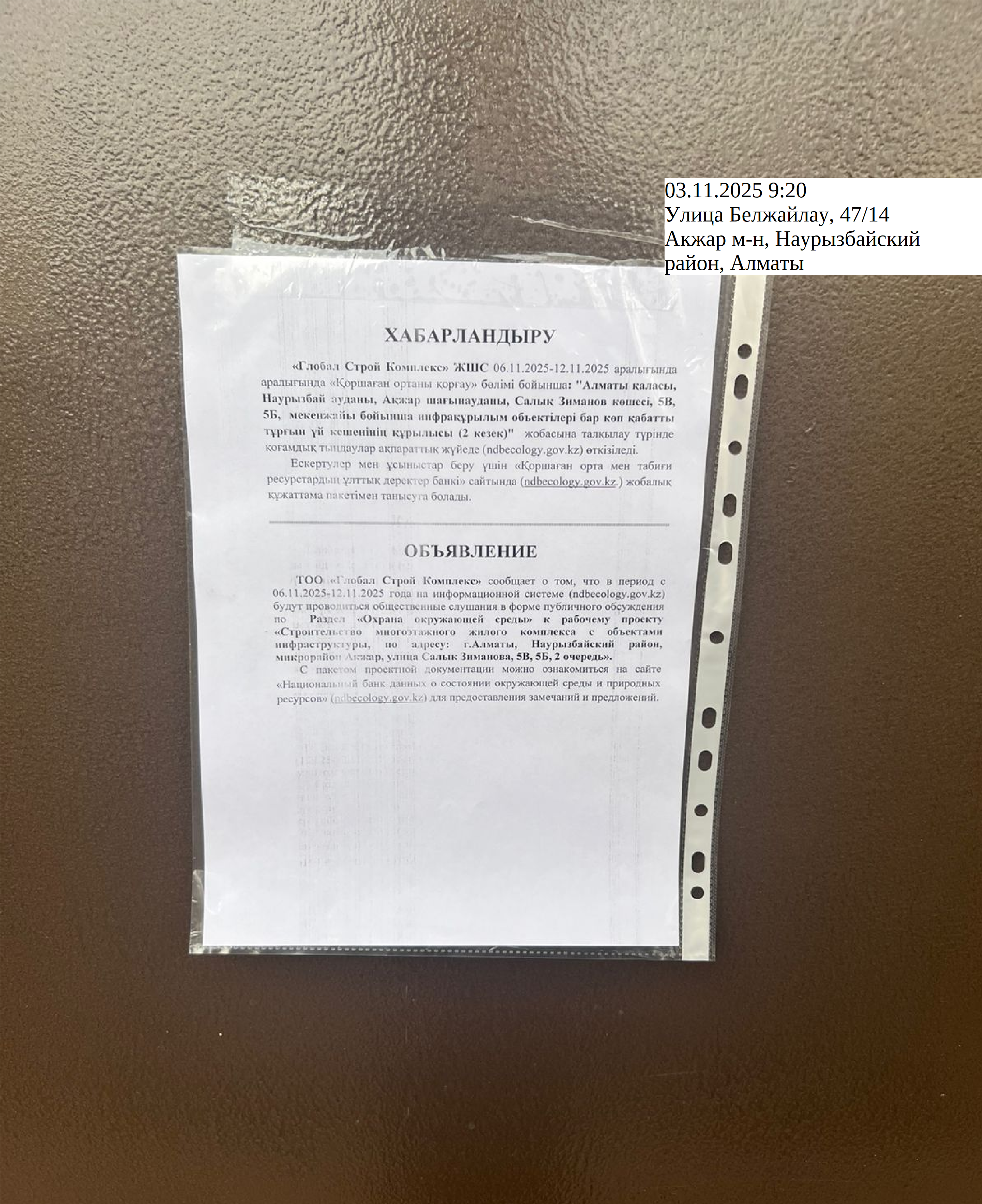 По проекту: Раздел «Охрана окружающей среды» к рабочему проекту «Строительство многоэтажного жилого комплекса с объектами инфраструктуры, по адресу: г.Алматы, Наурызбайский район, микрорайон Акжар, улица Салык Зиманова, 5В, 5Б, 2 очередь».