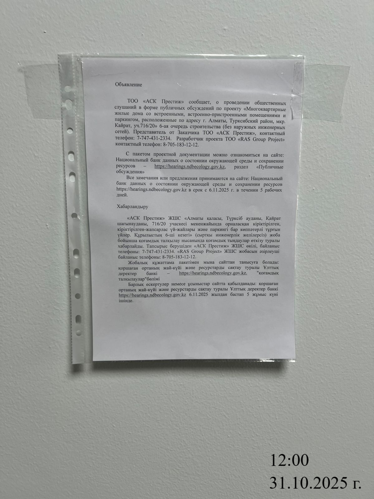 По проекту: «Многоквартирные жилые дома со встроенными, встроенно-пристроенными помещениями и паркингом, расположенные по адресу: г. Алматы, Турксибский район, мкр. Кайрат, уч.716/20» 6-ая очередь строительства (без наружных инженерных сетей)