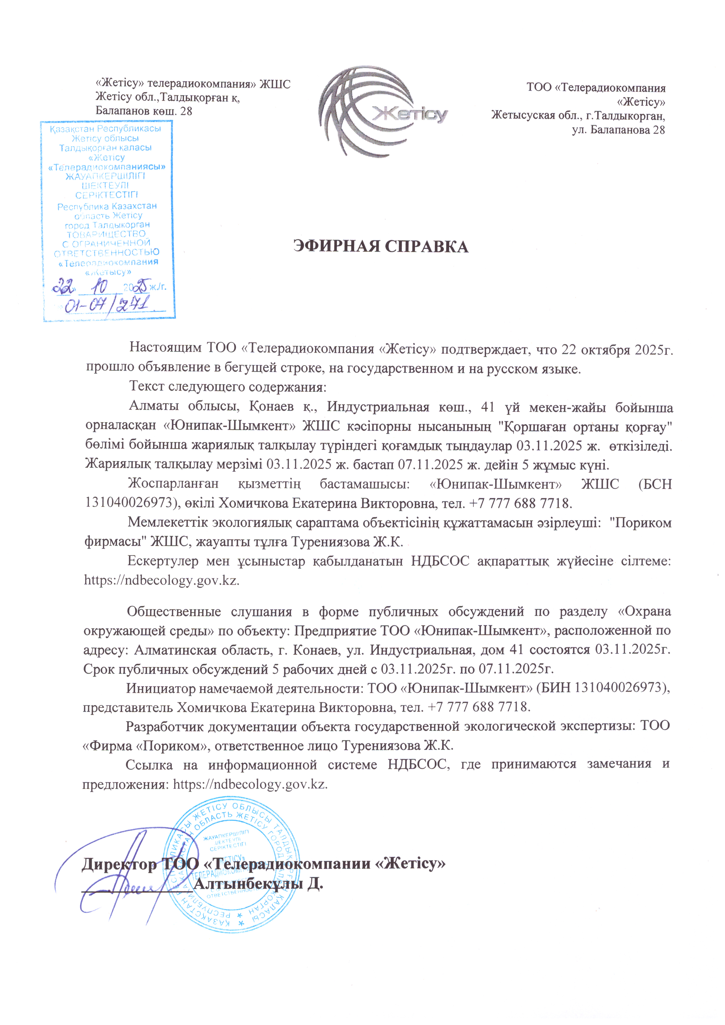 По проекту: Раздел "Охрана окружающей среды" для действующего объекта - Предприятие ТОО "Юнипак-Шымкент"