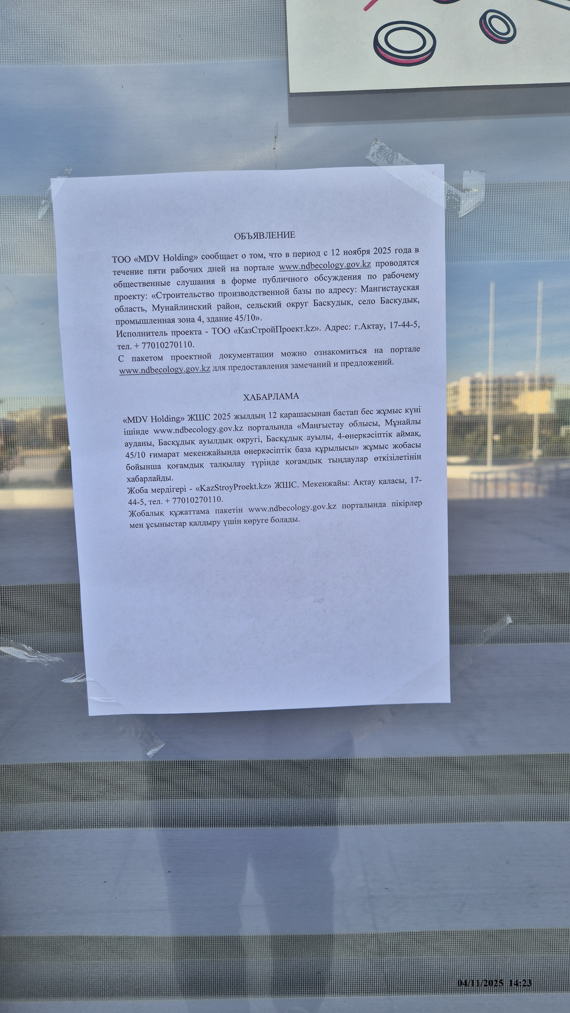 По проекту: «Строительство производственной базы по адресу: Мангистауская область, Мунайлинский район, сельский округ Баскудык, село Баскудык, промышленная зона 4, здание 45/10»