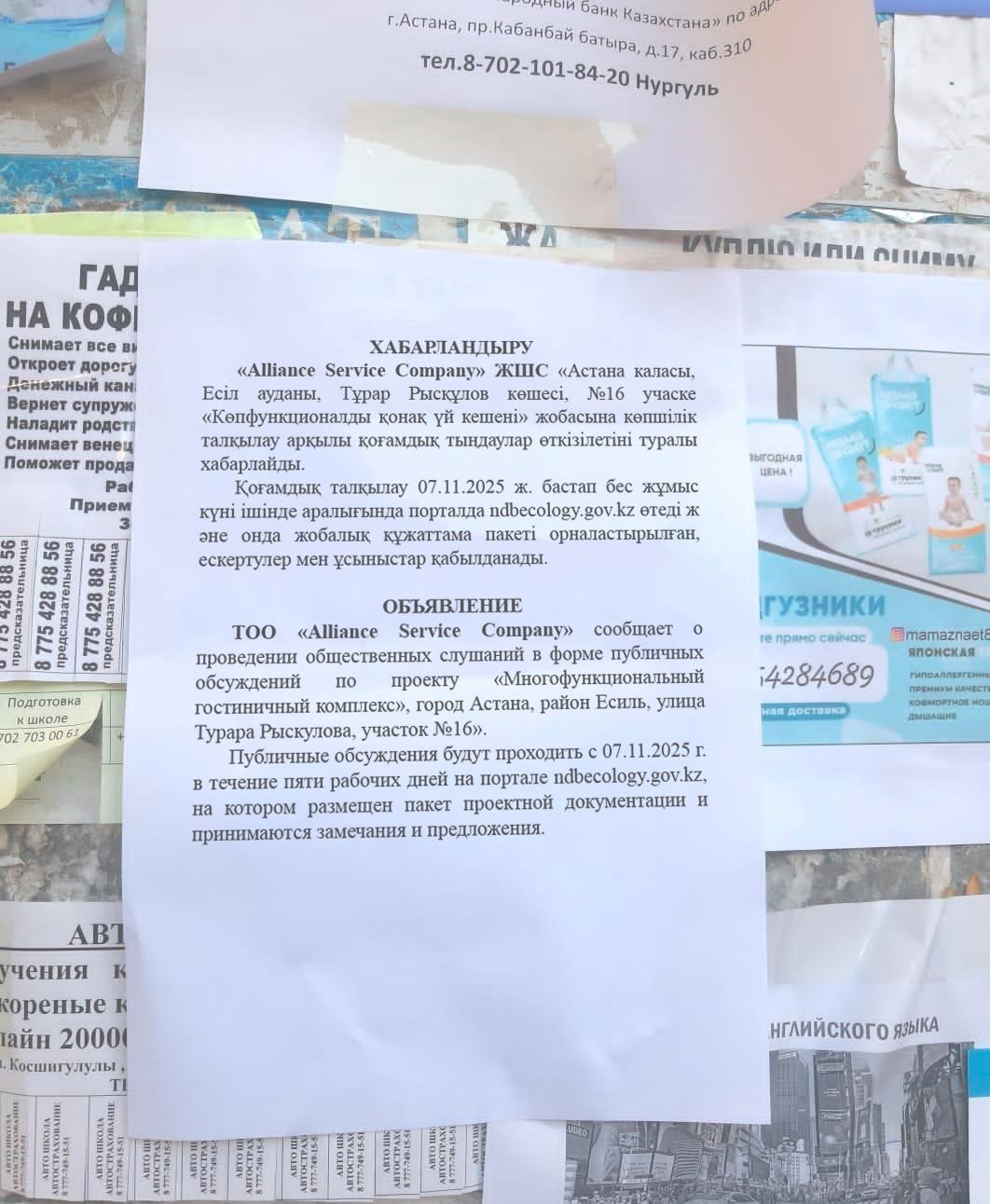 По проекту: «Многофункциональный гостиничный комплекс», город Астана, район Есиль, улица Турара Рыскулова, участок №16»