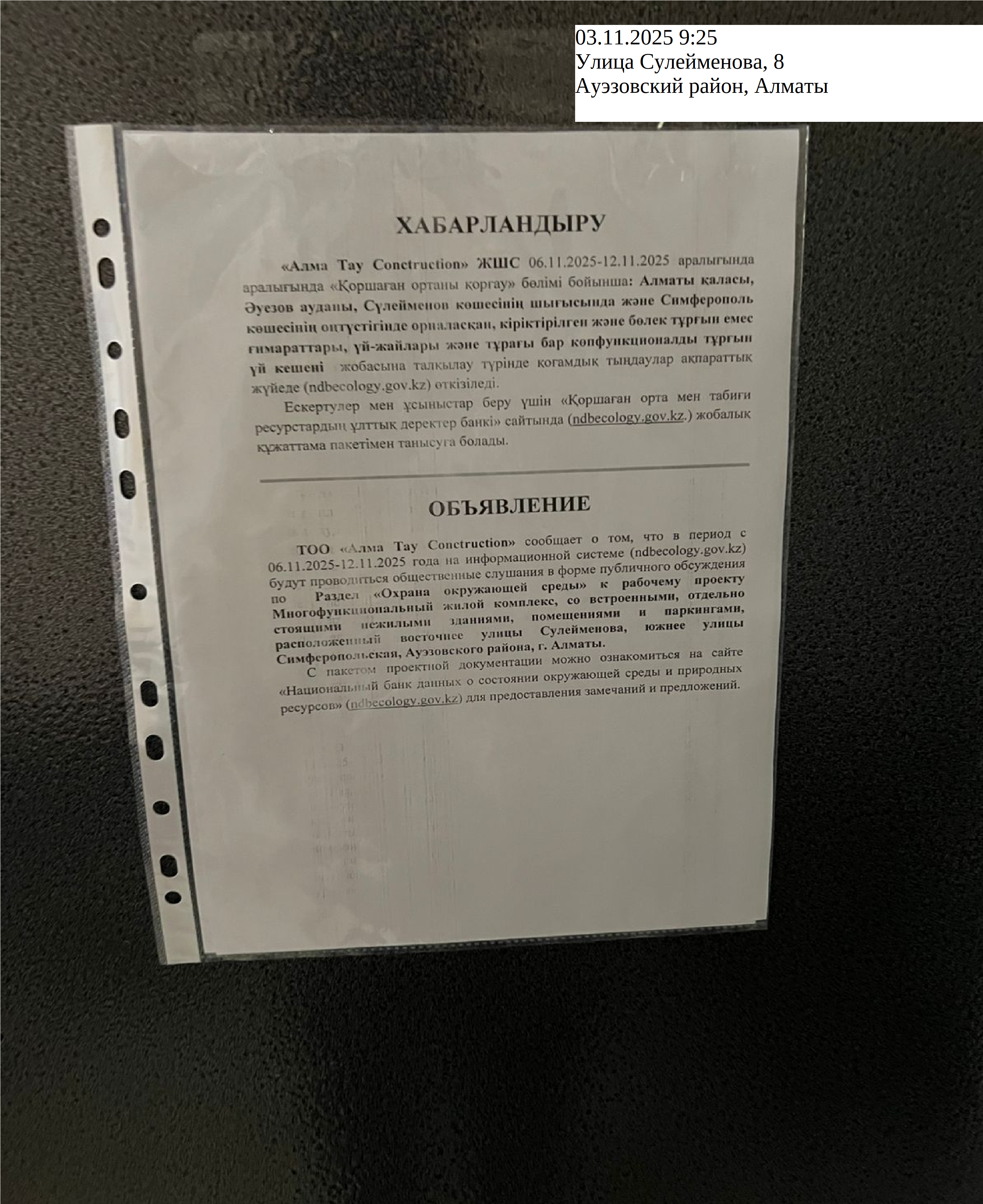 По проекту: Раздел охрана окружающей среды к рабочему проекту «Многофункциональный жилой комплекс, со встроенными, отдельно стоящими нежилыми зданиями, помещениями и паркингами, расположенный восточнее улицы Сулейменова, южнее улицы Симферопольская, Ауэзовского района, г. Алматы».