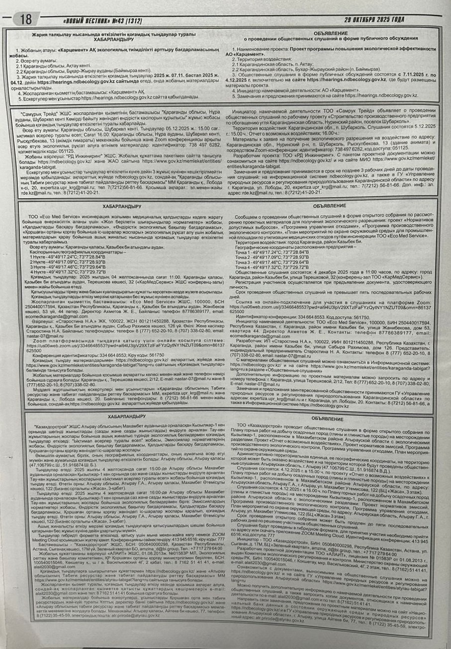 По проекту: Программа повышения экологической эффективности на период 2026 – 2035 годы для действующих объектов I категории согласно пункту 11 статьи 418 Кодекса