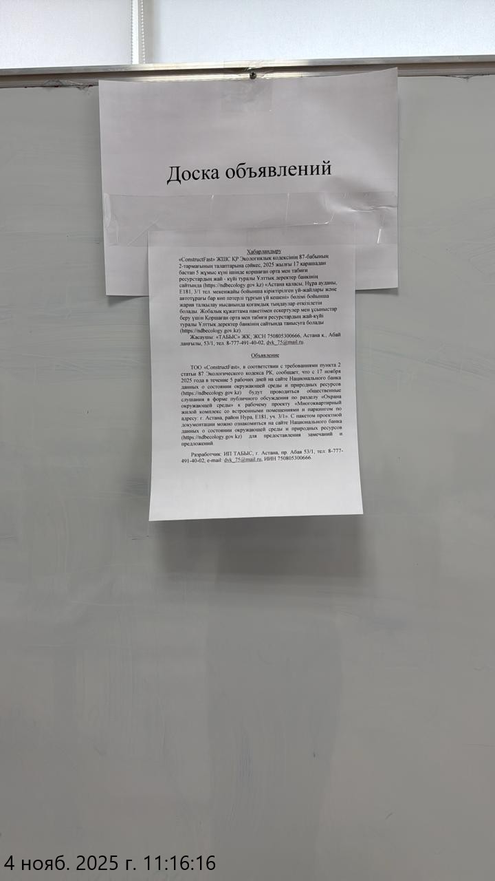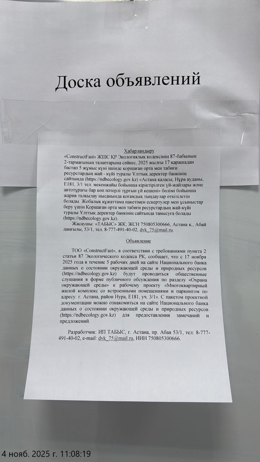 По проекту: Раздел «Охрана окружающей среды» к рабочему проекту «Многоквартирный жилой комплекс со встроенными помещениями и паркингом по адресу: г. Астана, район Нура, Е181, уч. 3/1»