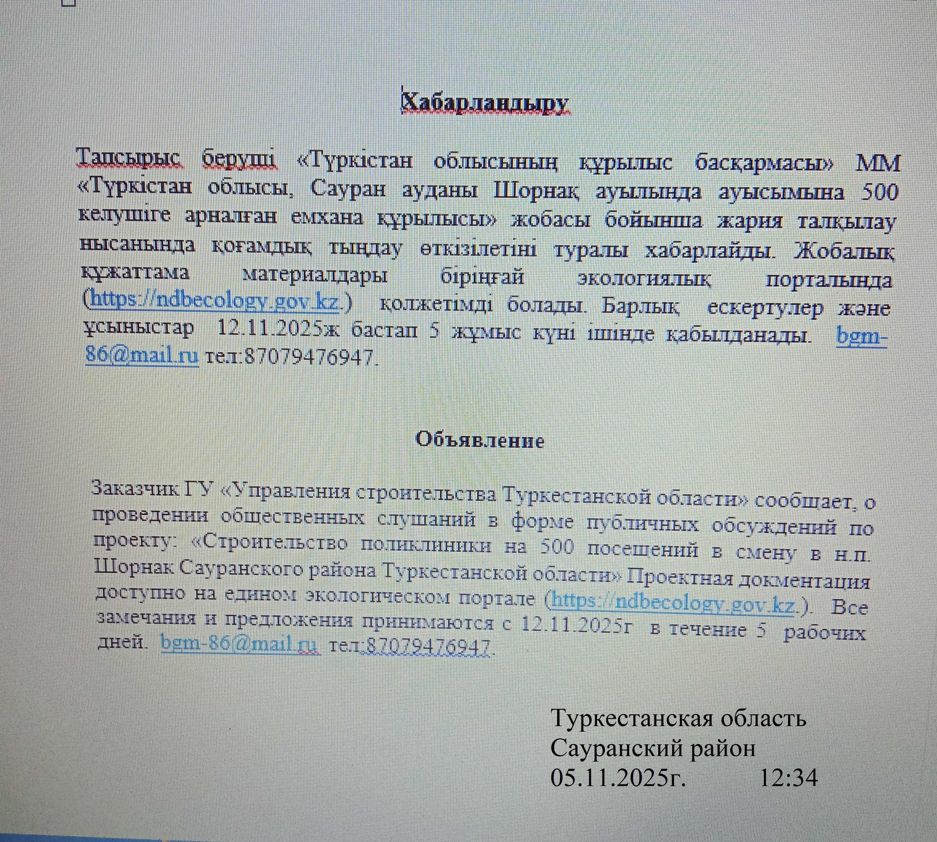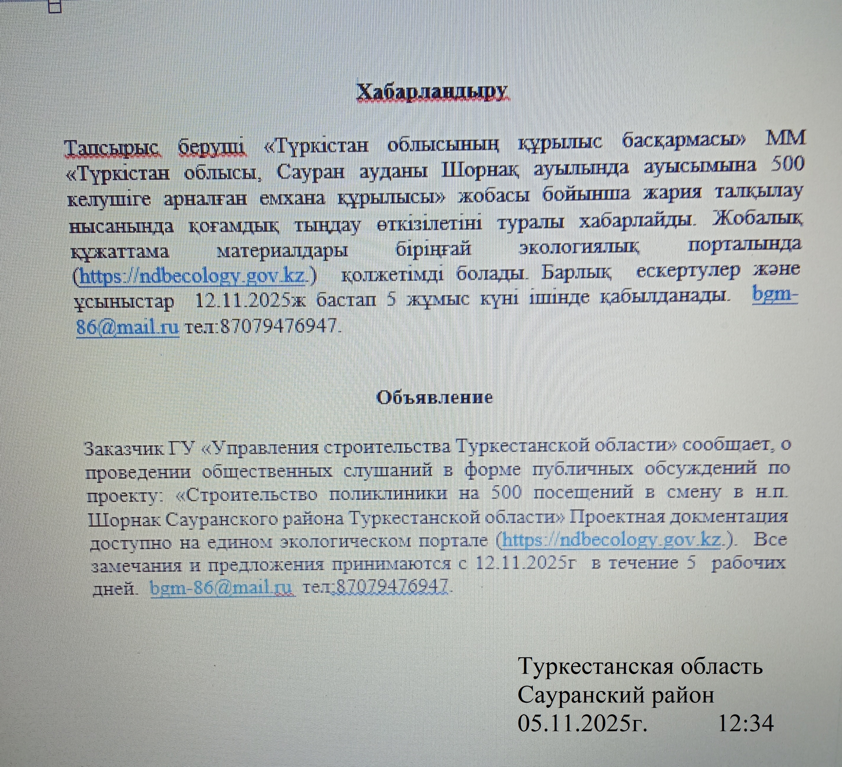 По проекту: «Строительство поликлиники на 500 посещений в смену в н.п. Шорнак Сауранского района Туркестанской области»