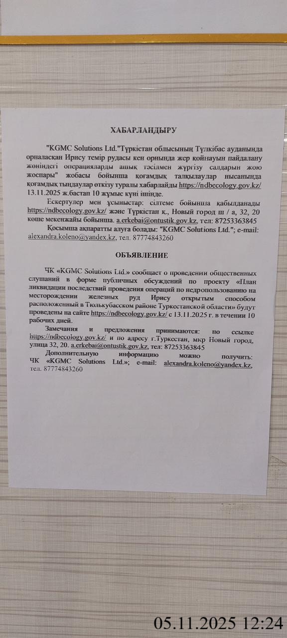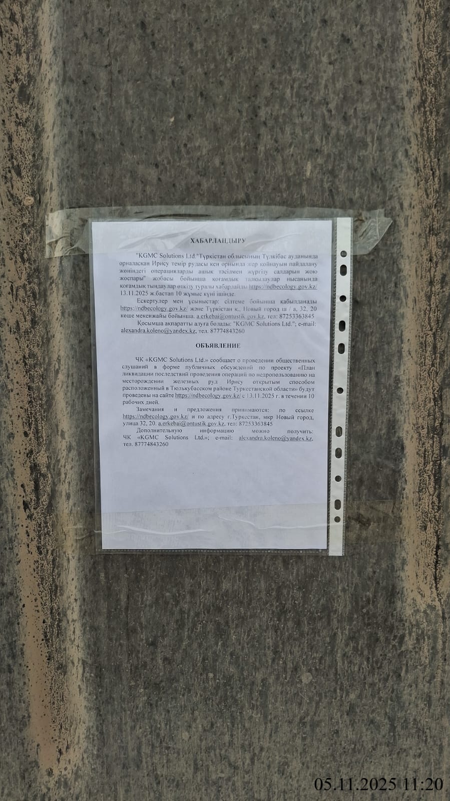 По проекту: ПЛАН ЛИКВИДАЦИИ ПОСЛЕДСТВИЙ ПРОВЕДЕНИЯ ОПЕРАЦИЙ ПО НЕДРОПОЛЬЗОВАНИЮ НА МЕСТОРОЖДЕНИИ ЖЕЛЕЗНЫХ РУД ИРИСУ ОТКРЫТЫМ СПОСОБОМ РАСПОЛОЖЕННЫЙ В ТЮЛЬКУБАССКОМ РАЙОНЕ ТУРКЕСТАНСКОЙ ОБЛАСТИ