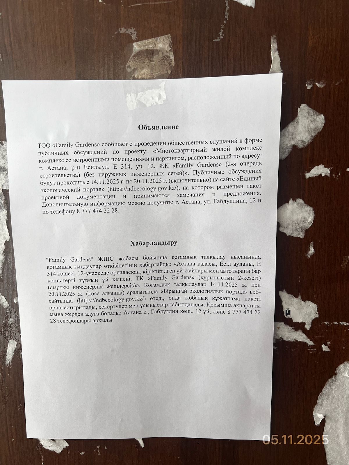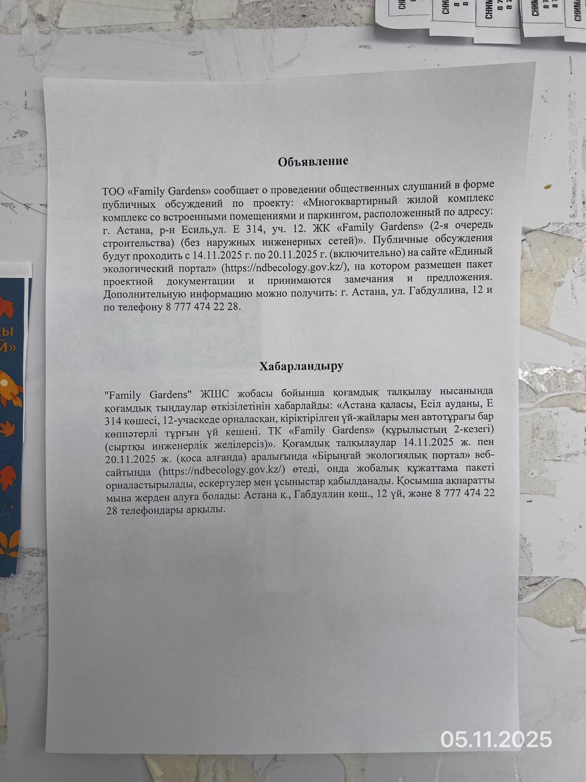 По проекту: «Многоквартирный жилой комплекс комплекс со встроенными помещениями и паркингом, расположенный по адресу: г. Астана, р-н Есиль, ул. Е 314, уч. 12. ЖК «Family Gardens» (2 очередь строительства)»