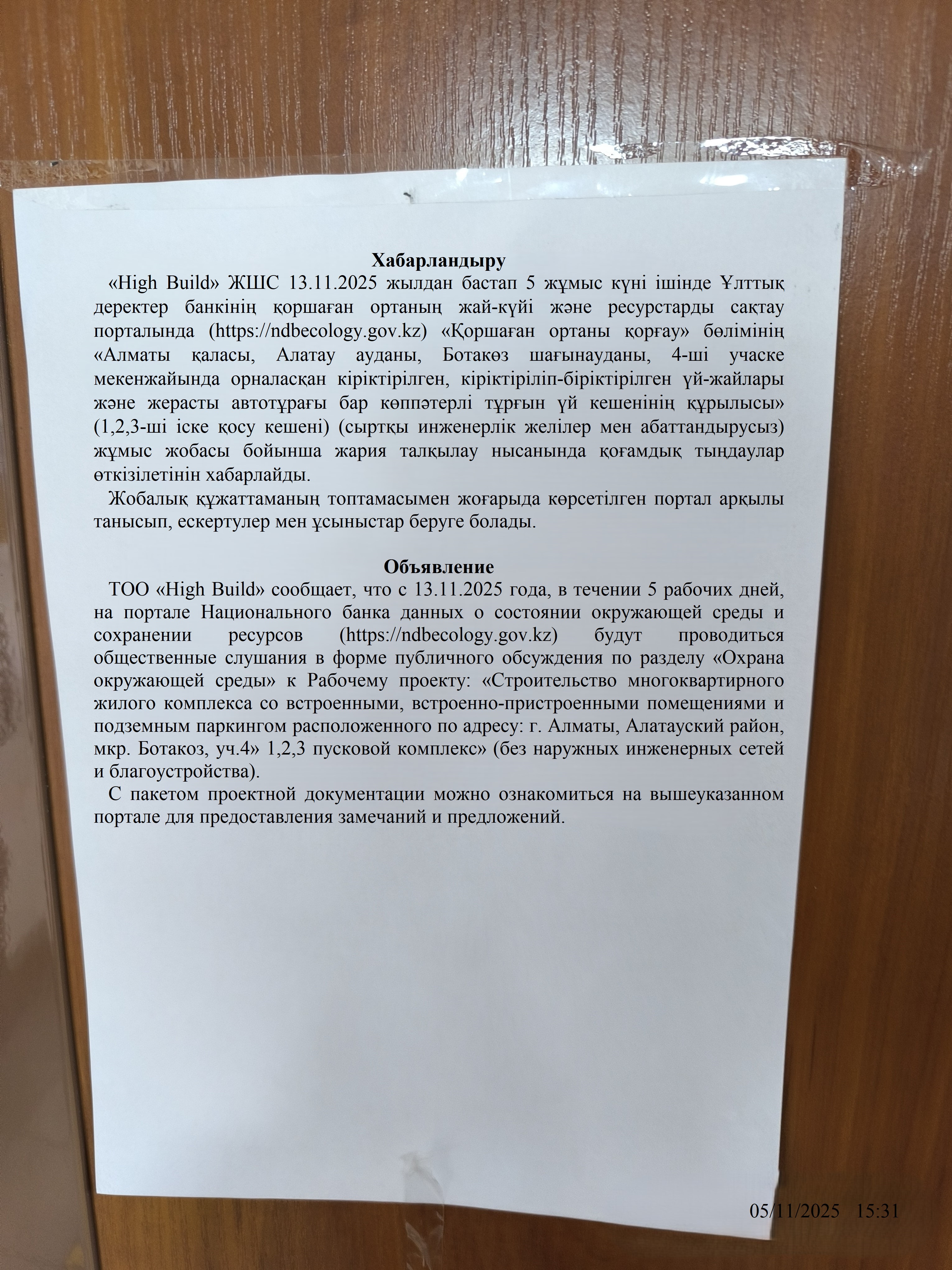 По проекту: Проект "Охрана окружающей среды" для объекта "Строительство многоквартирного жилого комплекса со встроенными, встроенно-пристроенными помещениями и подземным паркингом расположенного по адресу: г. Алматы, Алатауский район, мкр. Ботакоз, уч.4» 1 пусковой комплекс» (Без наружных инженерных сетей и благоустройства)"