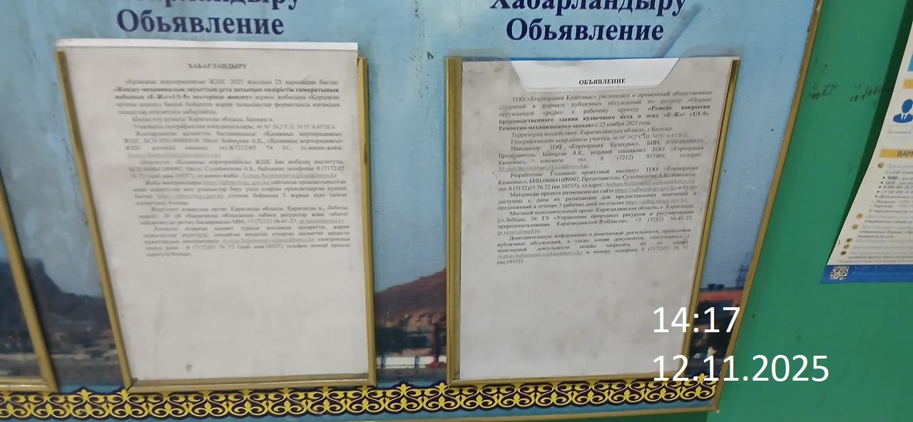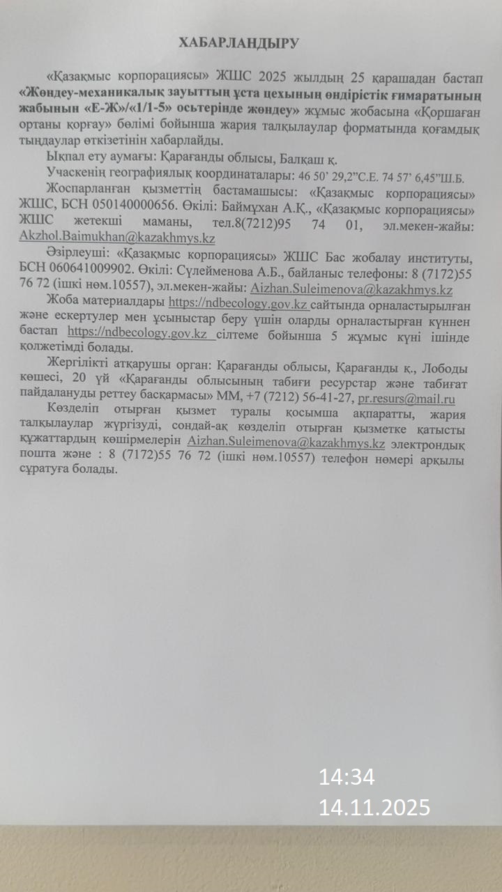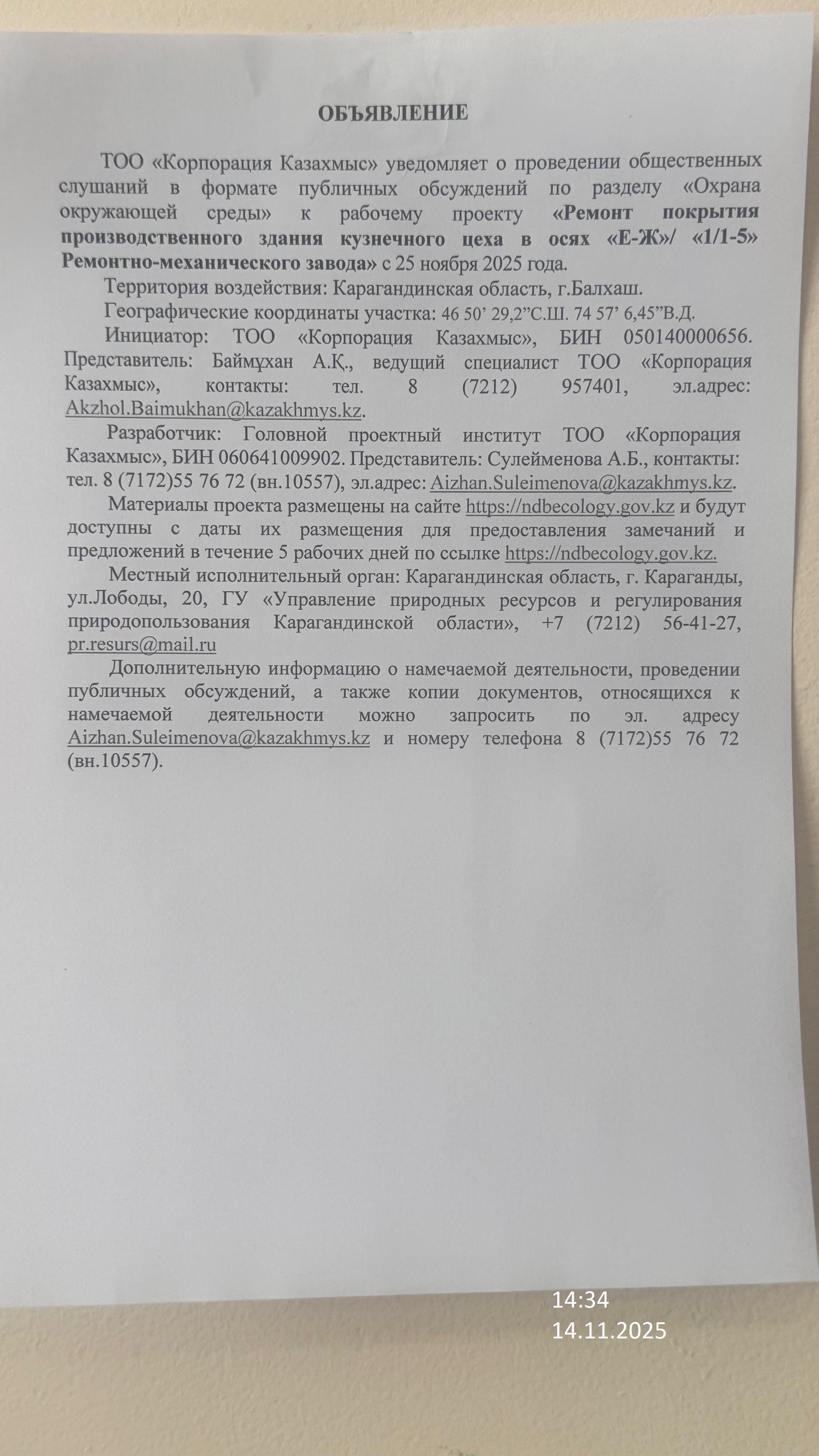 1.3. Контакты:akzhol.baimukhan@kazakhmys.kz; ;