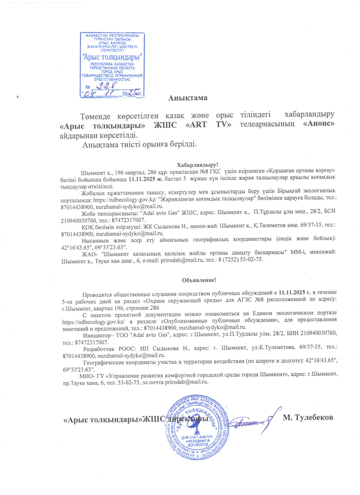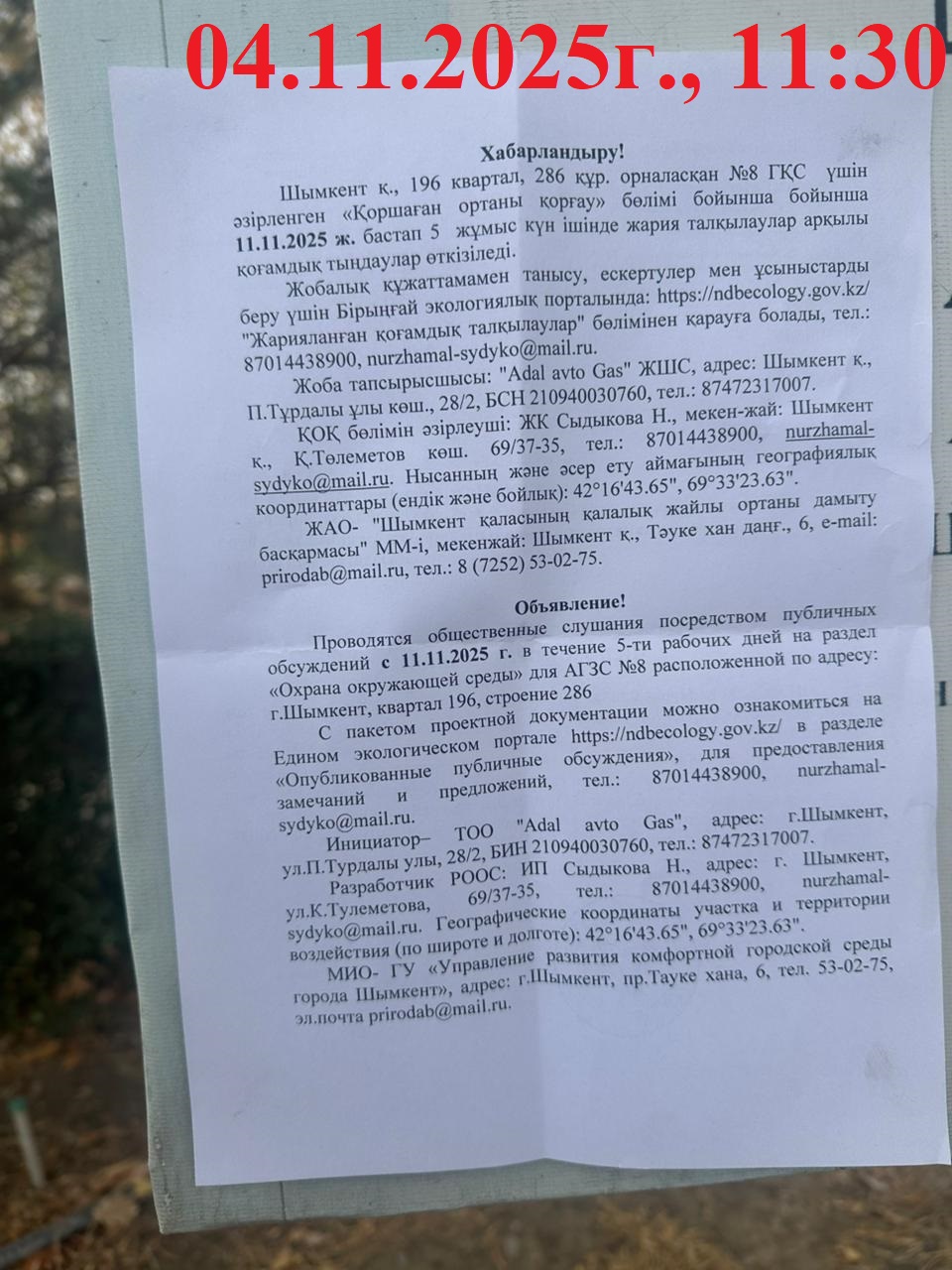По проекту: Раздел «Охрана окружающей среды» для АГЗС №8 расположенной по адресу: г.Шымкент, квартал 196, строение 286