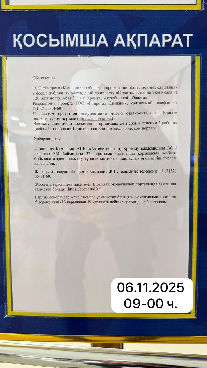 По проекту: Строительство детского сада на 320 мест по пр. Абая 3М в г. Хромтау Актюбинской области