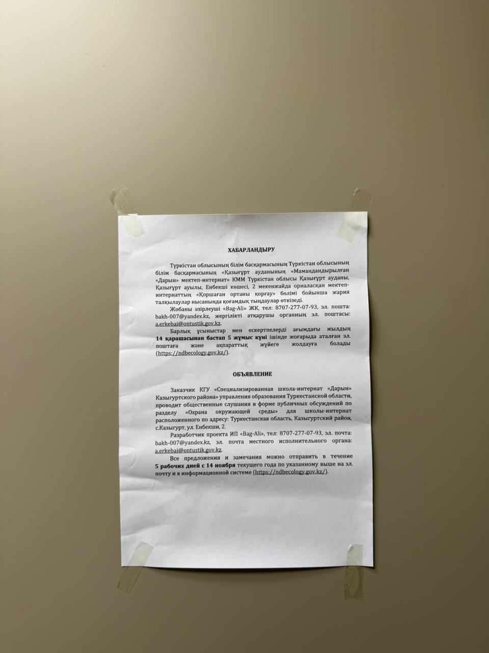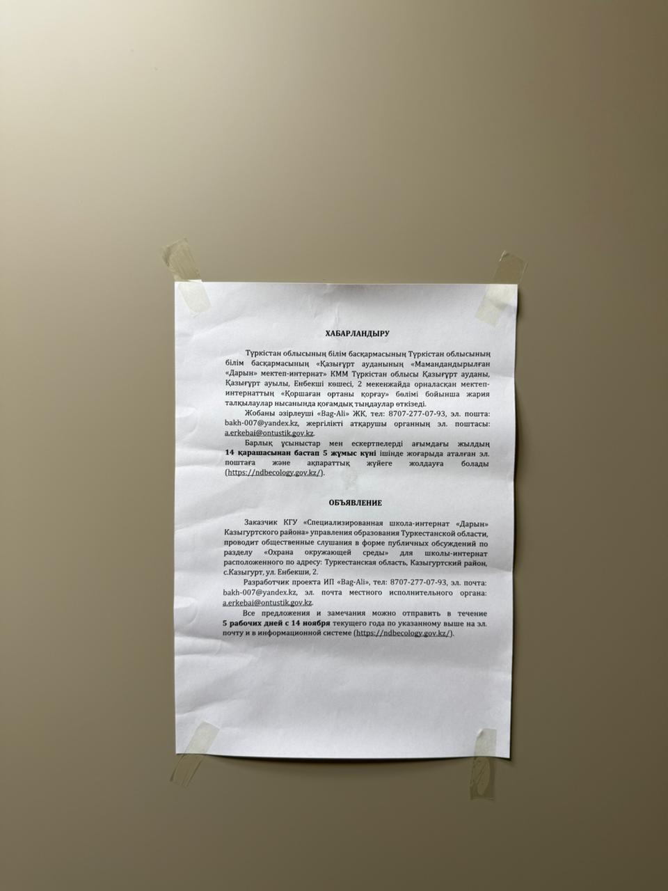 По проекту: РАЗДЕЛ «ОХРАНЫ ОКРУЖАЮЩЕЙ СРЕДЫ» для КГУ «Специализированная школа-интернат «Дарын» Казыгуртского района» управления образования Туркестанской области расположенного по адресу: Туркестанская область, Казыгуртский район, с.Казыгурт, ул. Енбекши, 2
