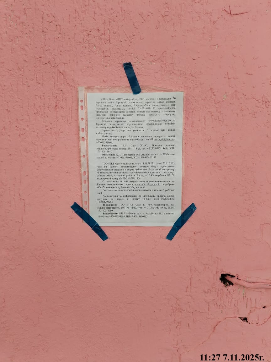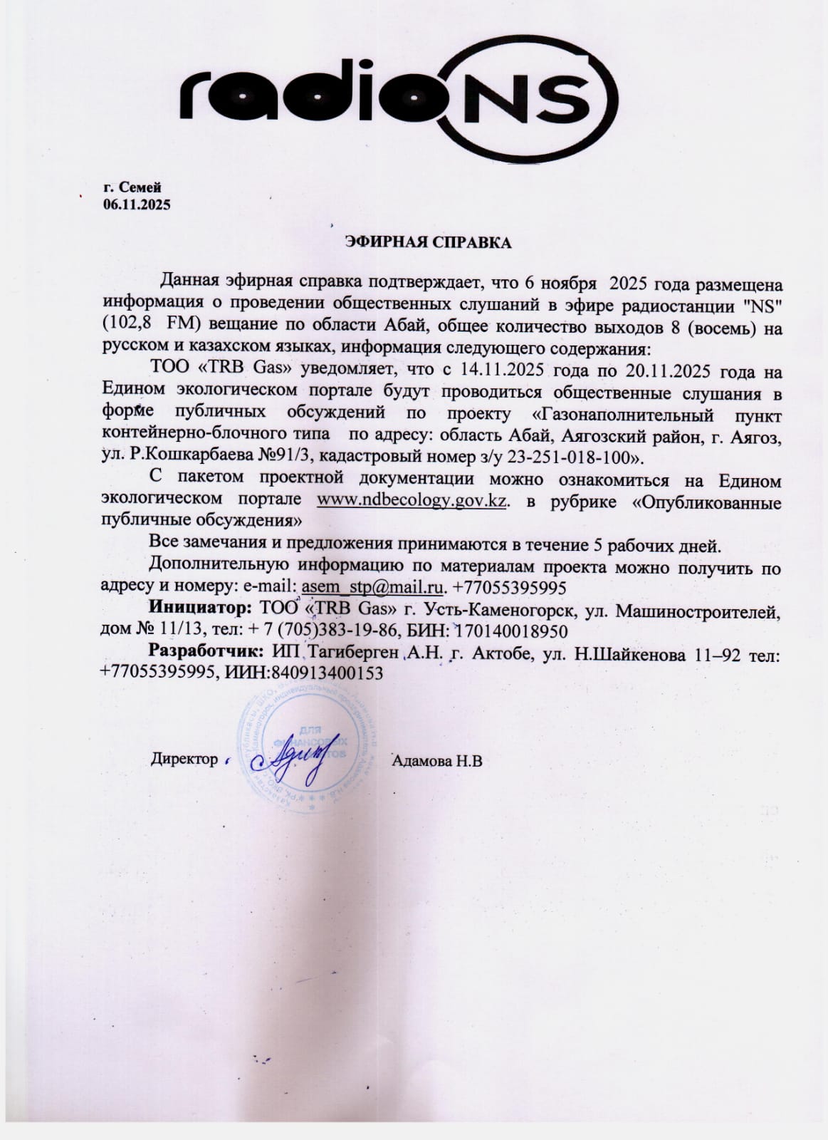 По проекту: Раздел охраны окружающей среды (РООС) к рабочему проекту «Газонаполнительный пункт контейнерно-блочного типа по адресу: область Абай, Аягозский район, г.Аягоз, ул.Р.Кошкарбаева №91/3, кадастровый номер з/у 23-251-018-100»