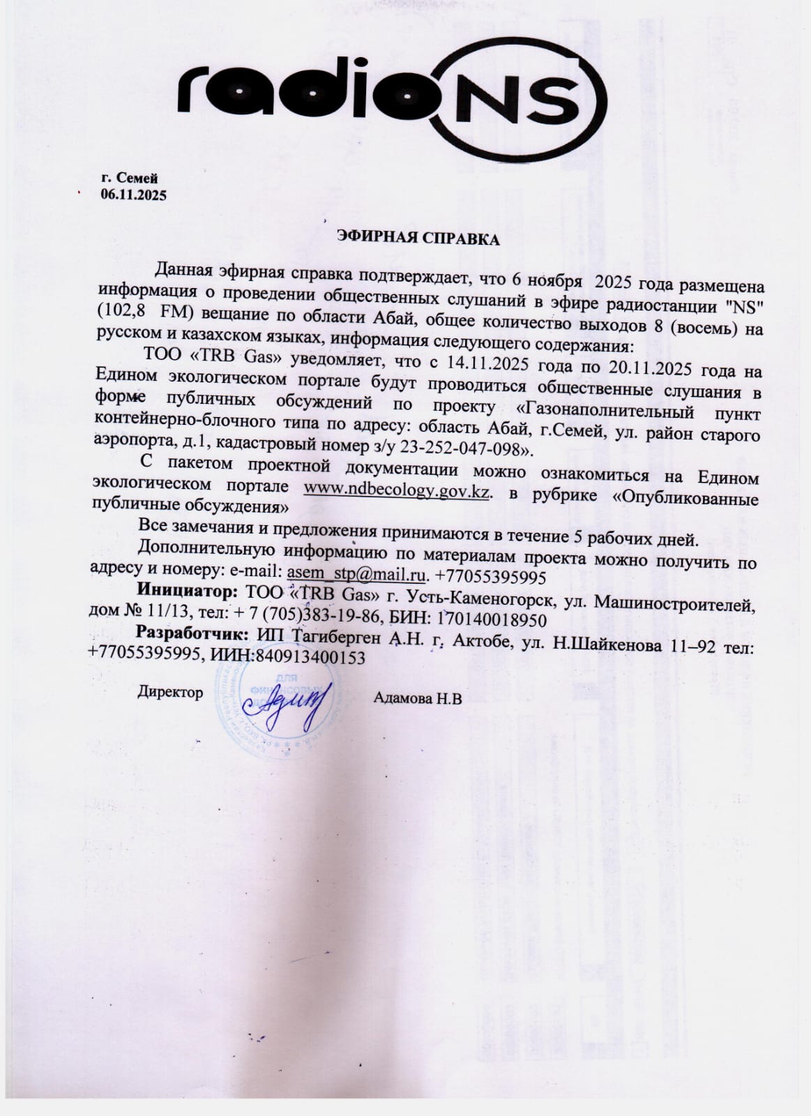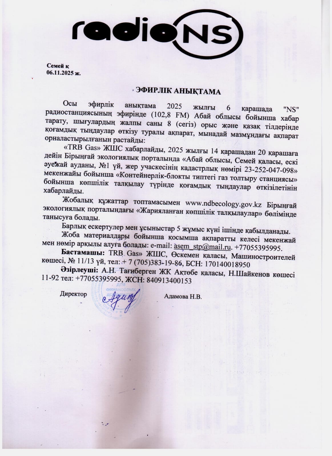 По проекту: Раздел охраны окружающей среды (РООС) к рабочему проекту «Газонаполнительный пункт контейнерно-блочного типа по адресу: область Абай, г. Семей, ул. район старого аэропорта, д.1, кадастровый номер з/у 23-252-047-098»