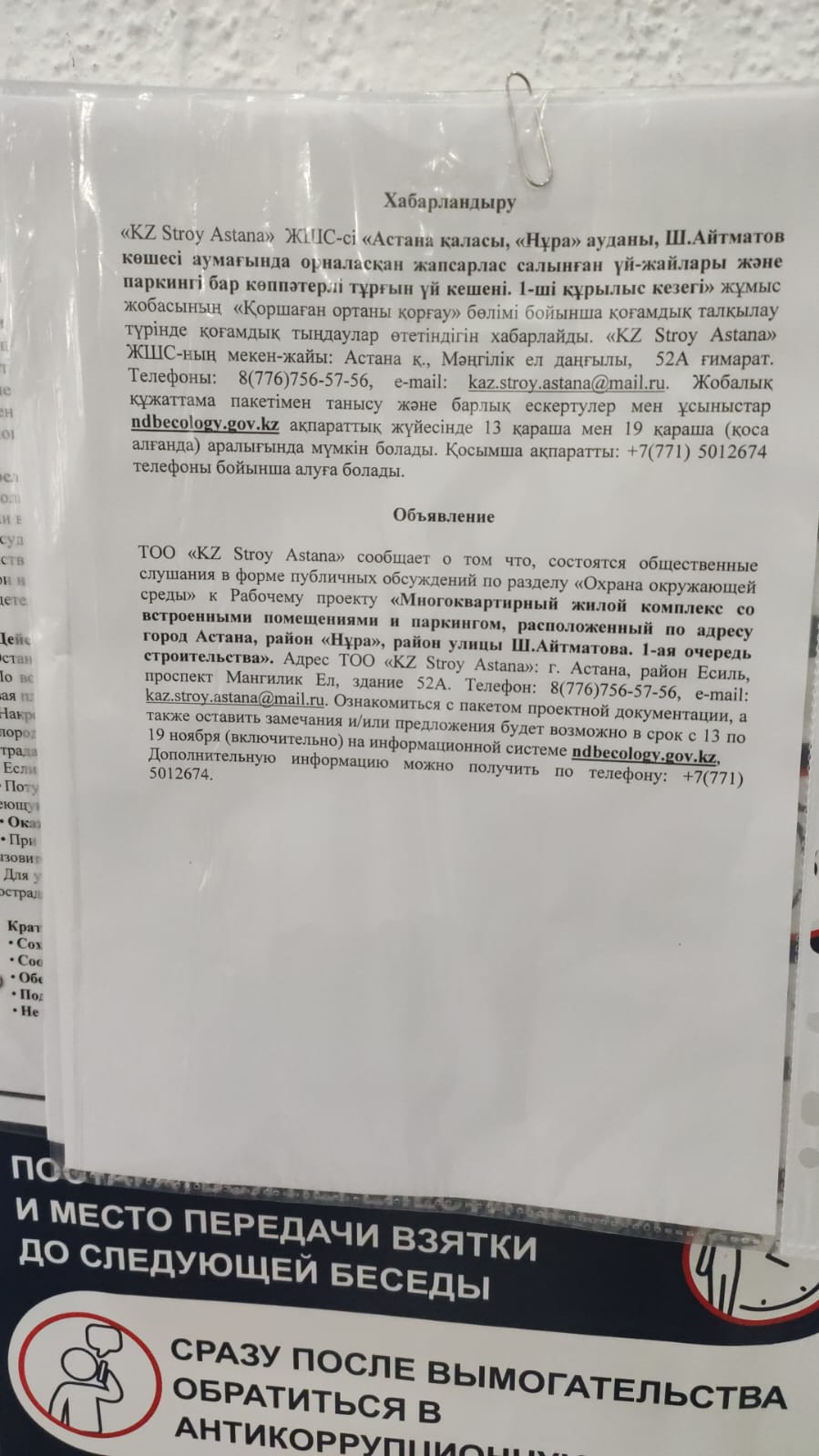 По проекту: «Многоквартирный жилой комплекс со встроенными помещениями и паркингом, расположенный по адресу город Астана, район «Нұра», район улицы Ш.Айтматова. 1-ая очередь строительства»