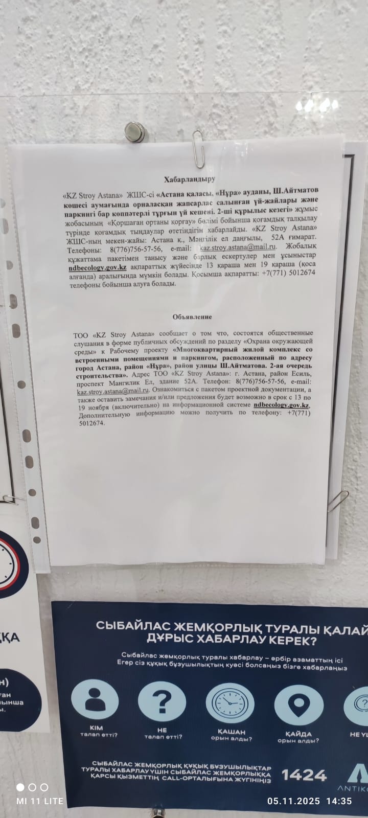По проекту: «Многоквартирный жилой комплекс со встроенными помещениями и паркингом, расположенный по адресу город Астана, район "Нұра", район улицы Ш.Айтматова. 2-ая очередь строительства»