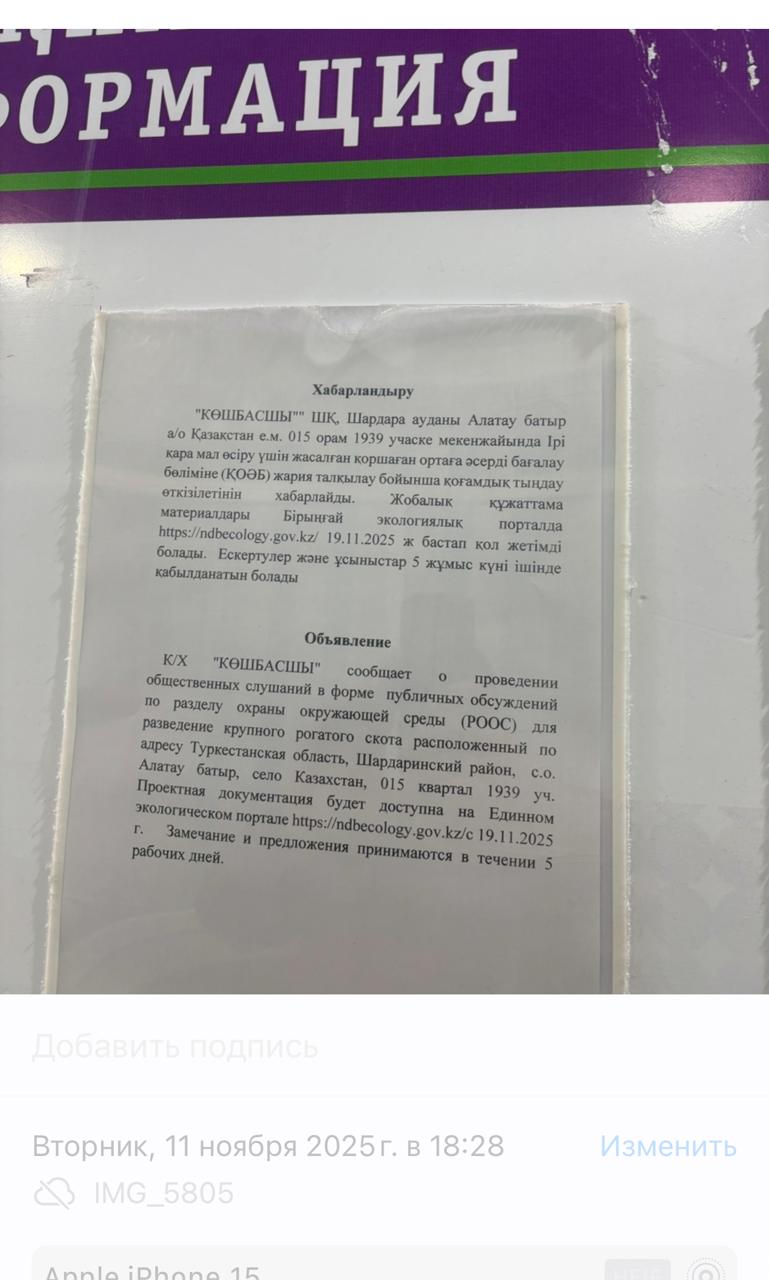 По проекту: разведение крупного рогатого скота К/Х "КӨШБАСШЫ" расположенной по адресу: Туркестанская область, Шардаринский район, с.о. Алатау батыр, село Казахстан, 015 квартал 1939 уч