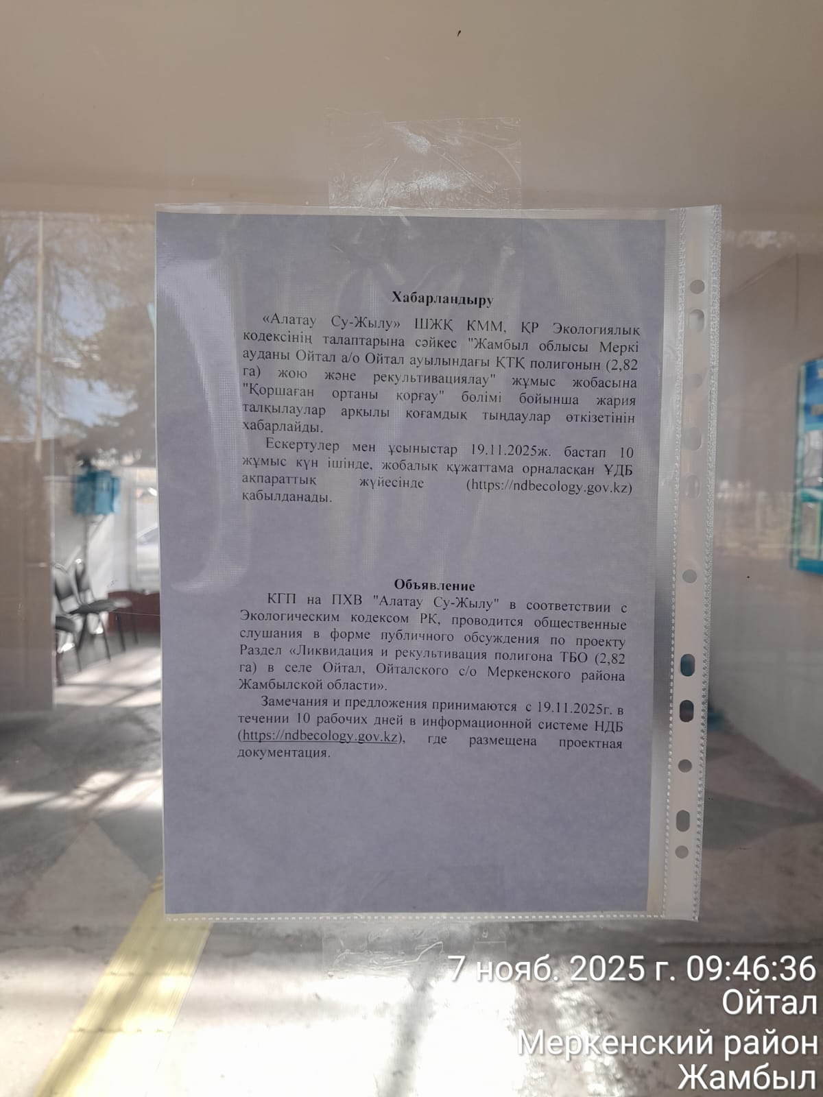 По проекту: Раздел «Охрана окружающей среды» к рабочему проекту «Ликвидация и рекультивация полигона ТБО (2,82 га) в селе Ойтал Ойталского с/о Меркенского района Жамбылской области»