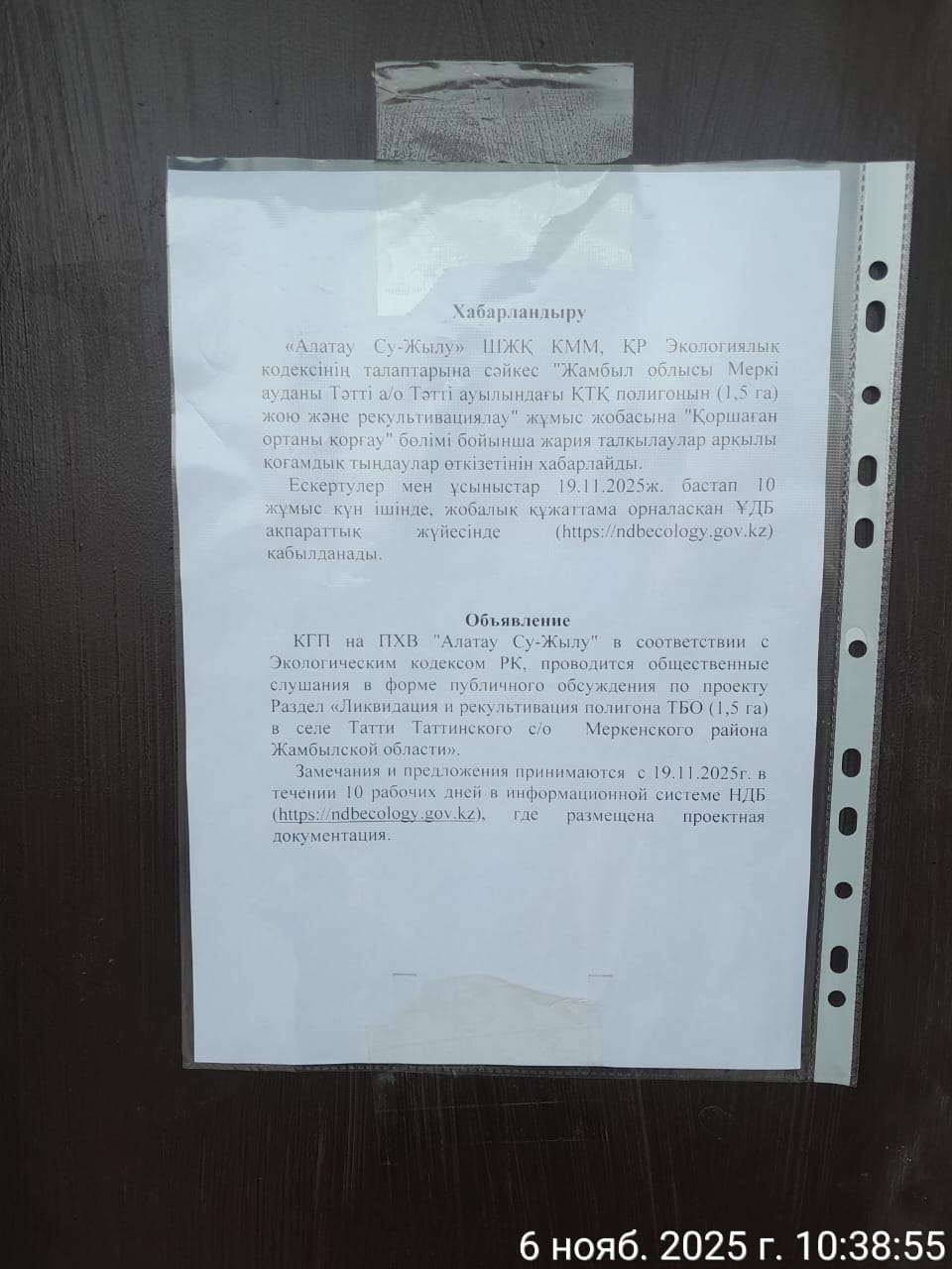 По проекту: Раздел «Охрана окружающей среды» к рабочему проекту «Ликвидация и рекультивация полигона ТБО (1,5 га) в селе Татти Таттинского с/о Меркенского района Жамбылской области»