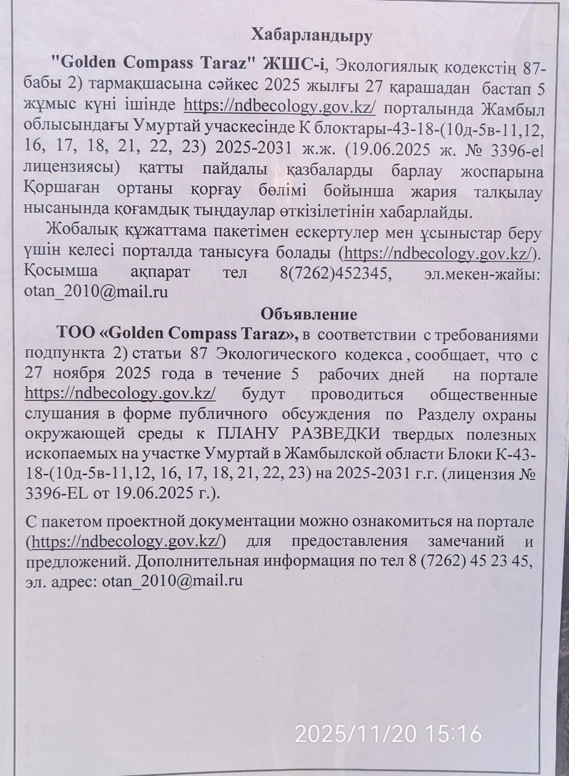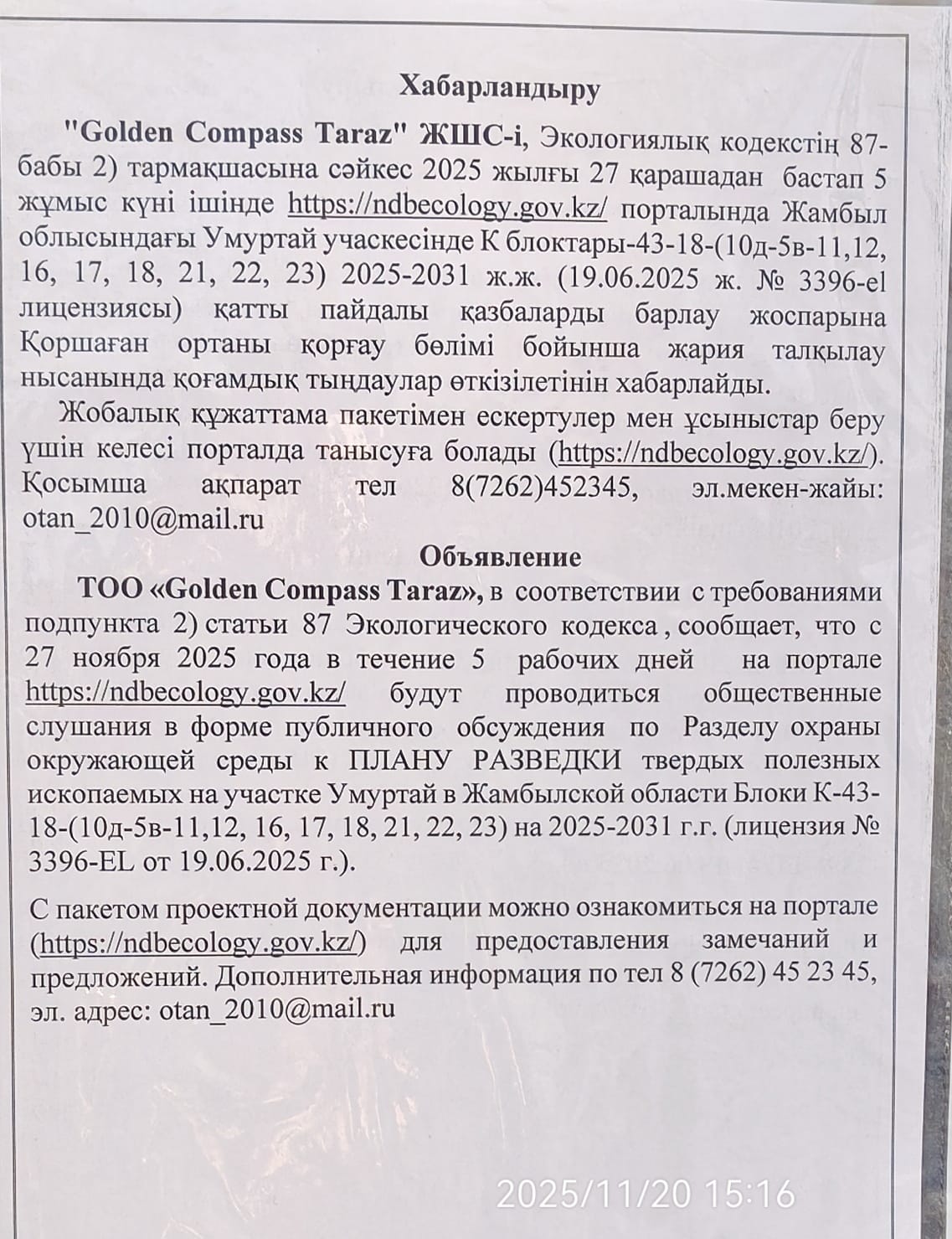 По проекту: РООС к ПЛАНУ РАЗВЕДКИ твердых полезных ископаемых на участке Умуртай в Жамбылской области Блоки К-43-18-(10д-5в-11,12, 16, 17, 18, 21, 22, 23) на 2025-2031 г.г. (лицензия № 3396-EL от 19.06.2025 г.)