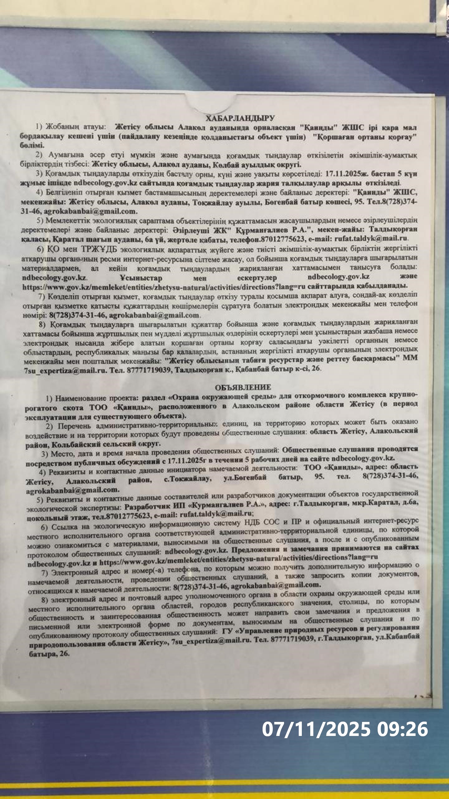 По проекту: Откормочный комплекс крупнорогатого скота ТОО «Қаинды», расположенного в Алакольском районе области Жетісу