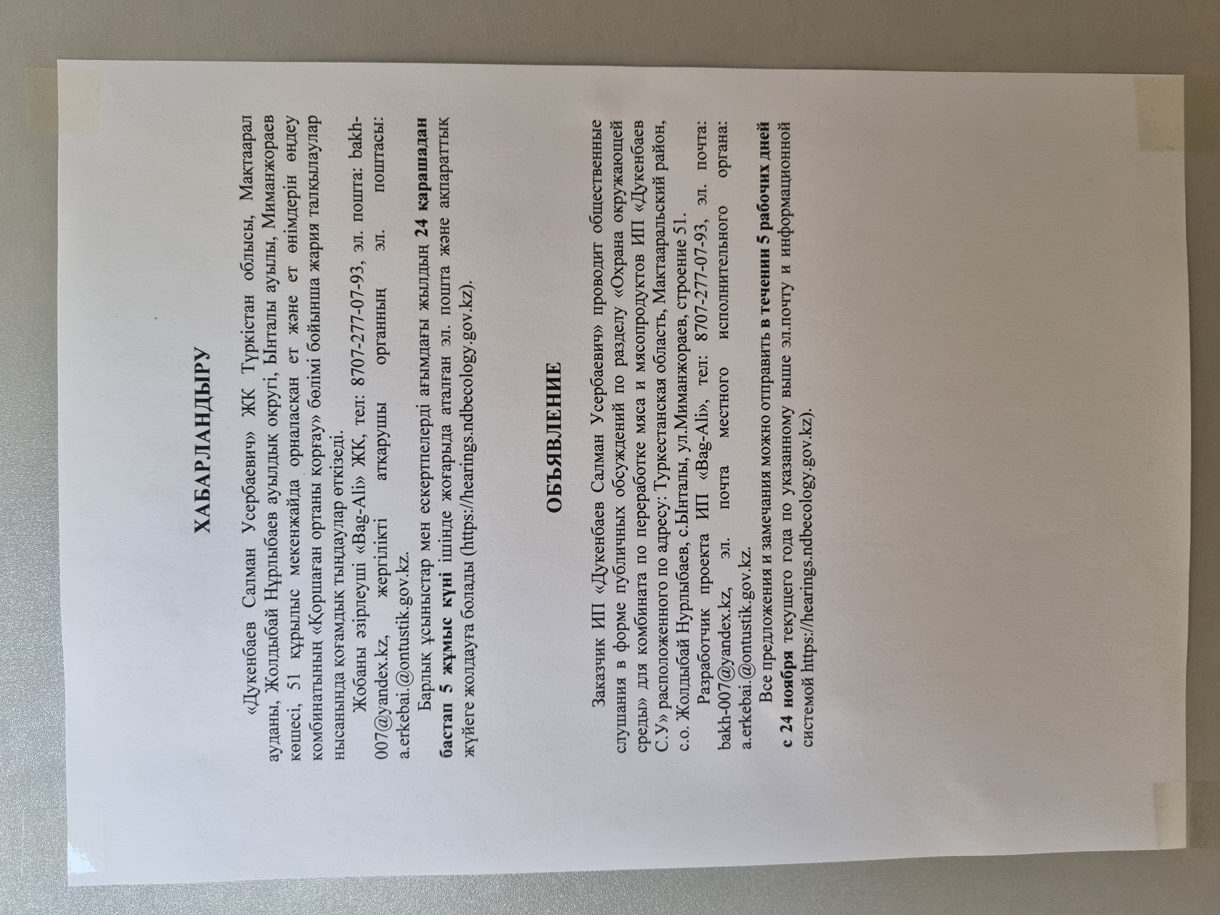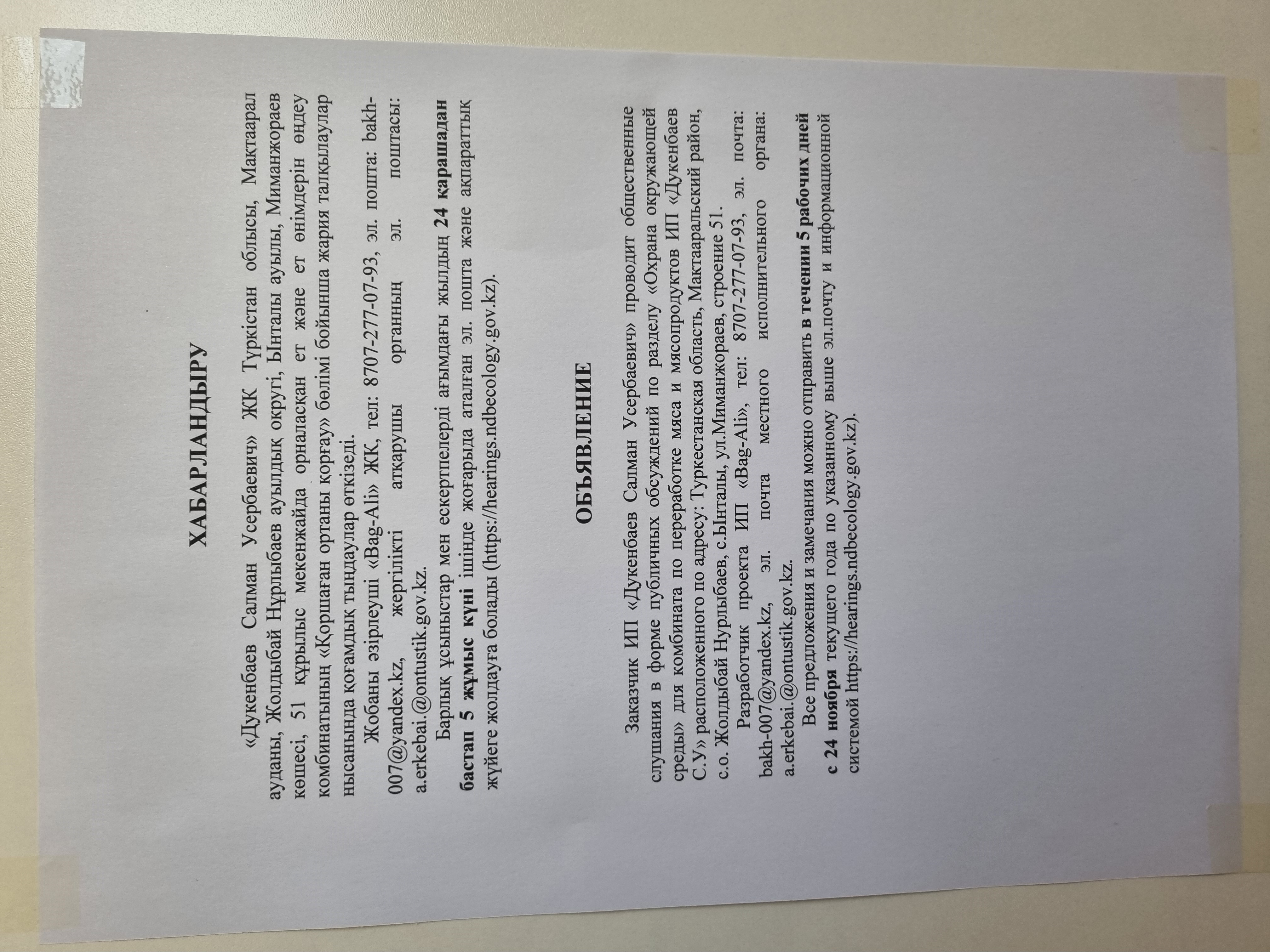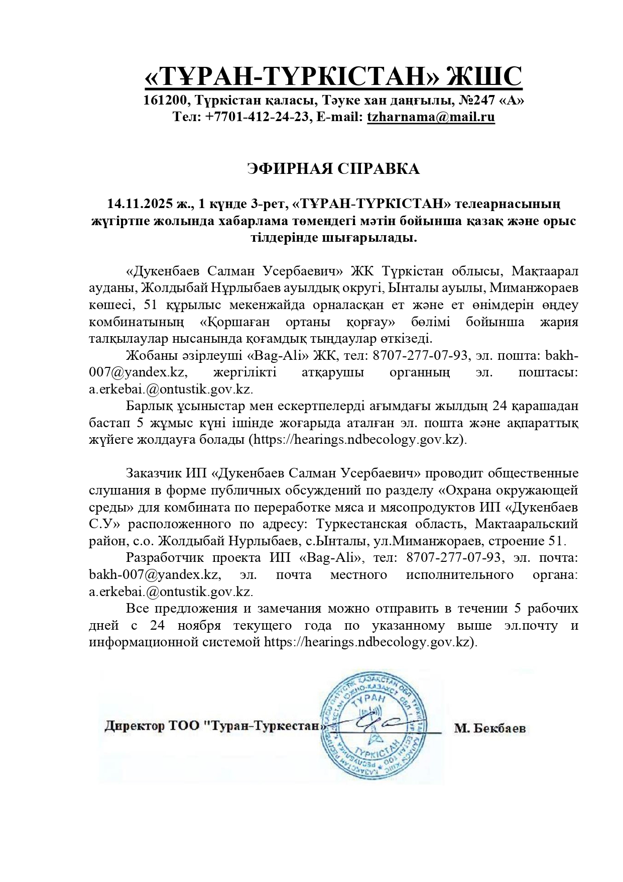 По проекту: РАЗДЕЛ «ОХРАНЫ ОКРУЖАЮЩЕЙ СРЕДЫ» для комбината по переработке мяса и мясопродуктов ИП «Дукенбаев С.У» расположенного по адресу: Туркестанская область, Мактааральский район, с.о. Жолдыбай Нурлыбаев, с.Ынталы, ул.Миманжораев, строение 51