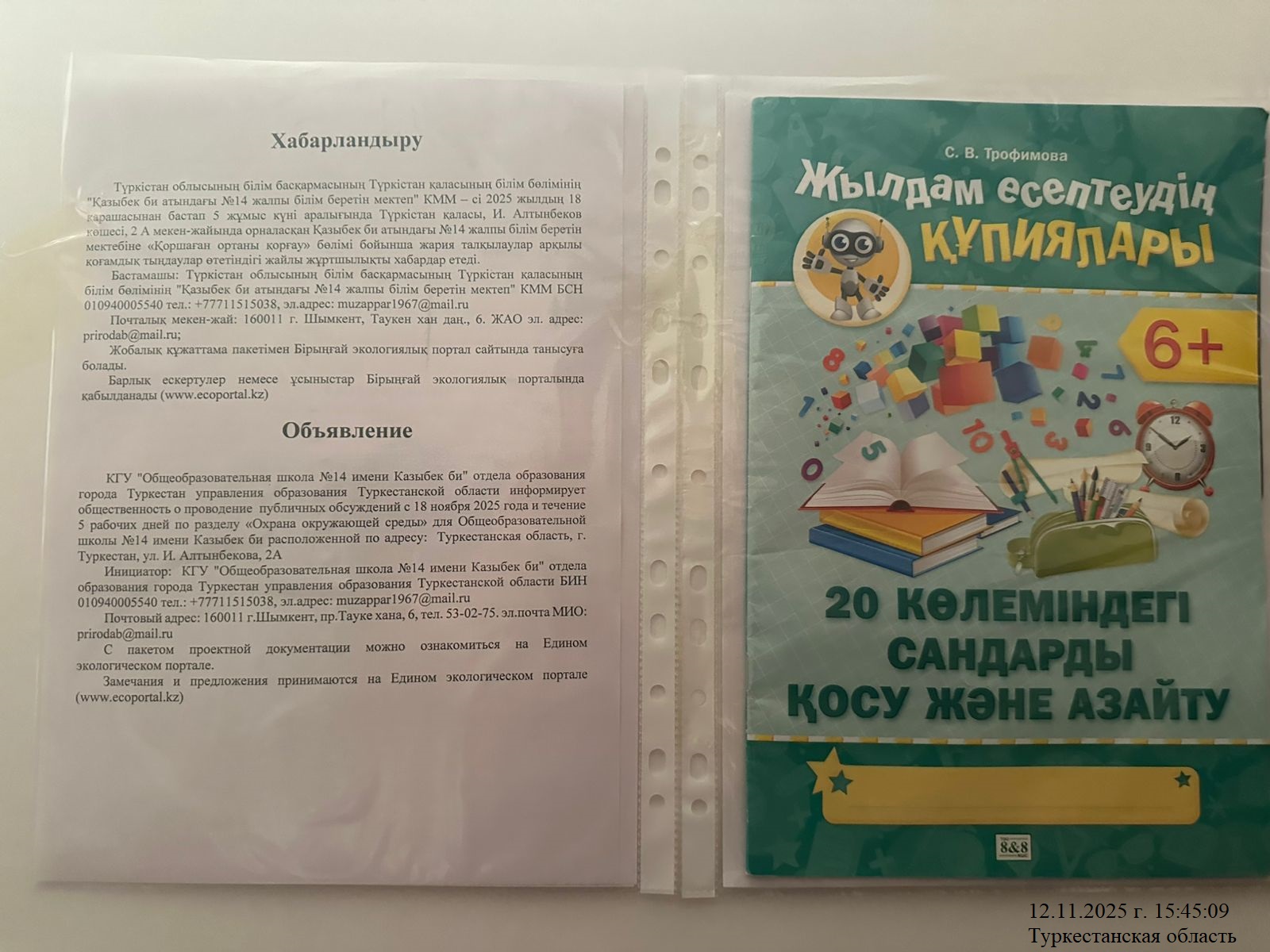 По проекту: РАЗДЕЛ «Охрана окружающей среды» для Коммунальное государственное учреждение "Общеобразовательная школа №14 имени Казыбек би" отдела образования города Туркестан управления образования Туркестанской области расположенной по адресу: Туркестанская область, г. Туркестан, ул. И.Алтынбекова, 2А
