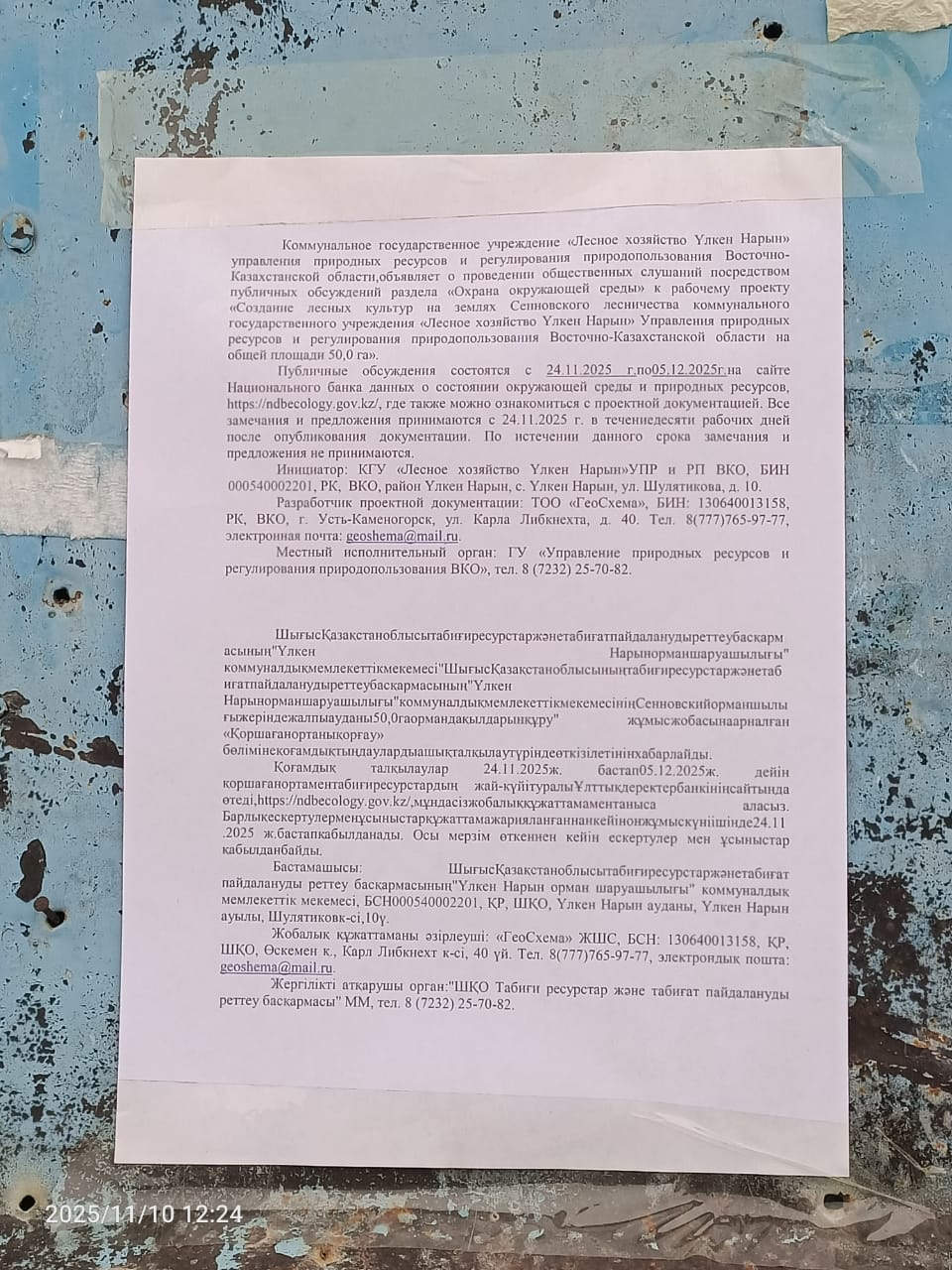 1. Инициатор: Коммунальное государственное учреждение ""Лесное хозяйство Үлкен Нарын"" управления природных ресурсов и регулирования природопользования Восточно-Казахстанской области