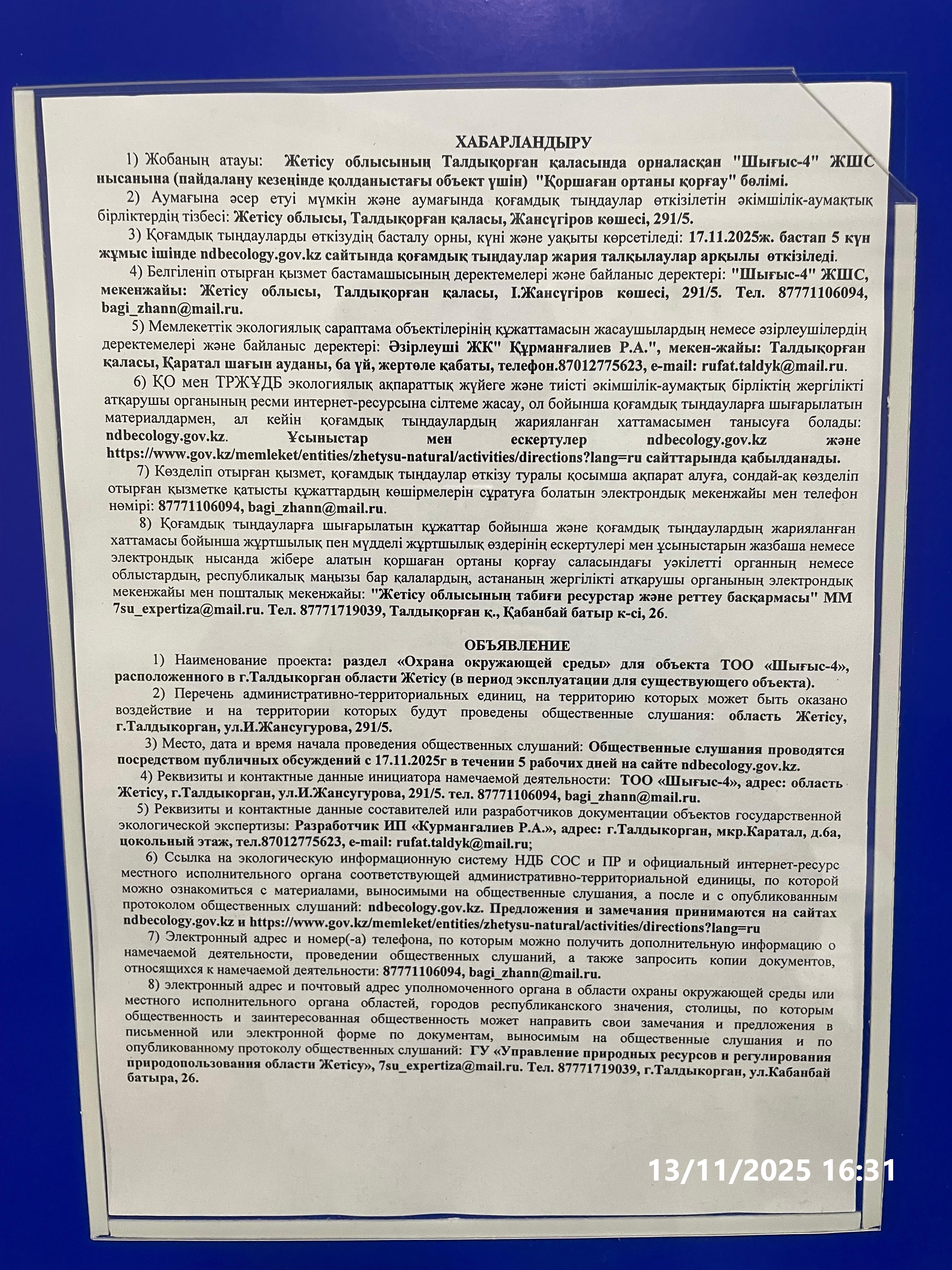 По проекту: ТОО «Шығыс-4» расположенный в г.Талдыкорган области Жетісу