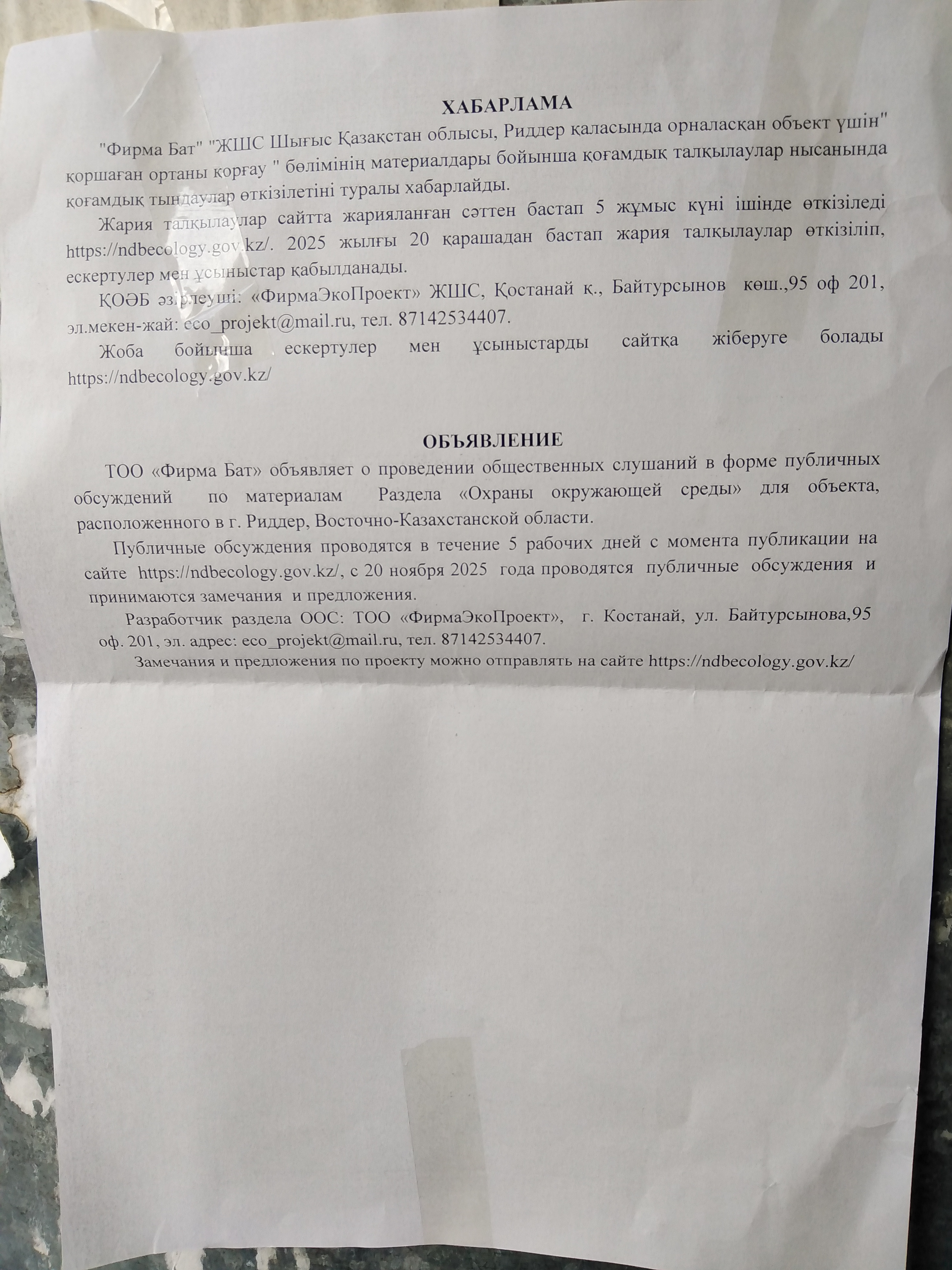 По проекту: Раздел «Охраны окружающей среды» для объекта, расположенного в г. Риддер, Восточно-Казахстанской области