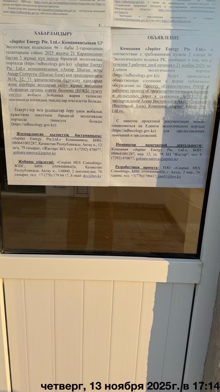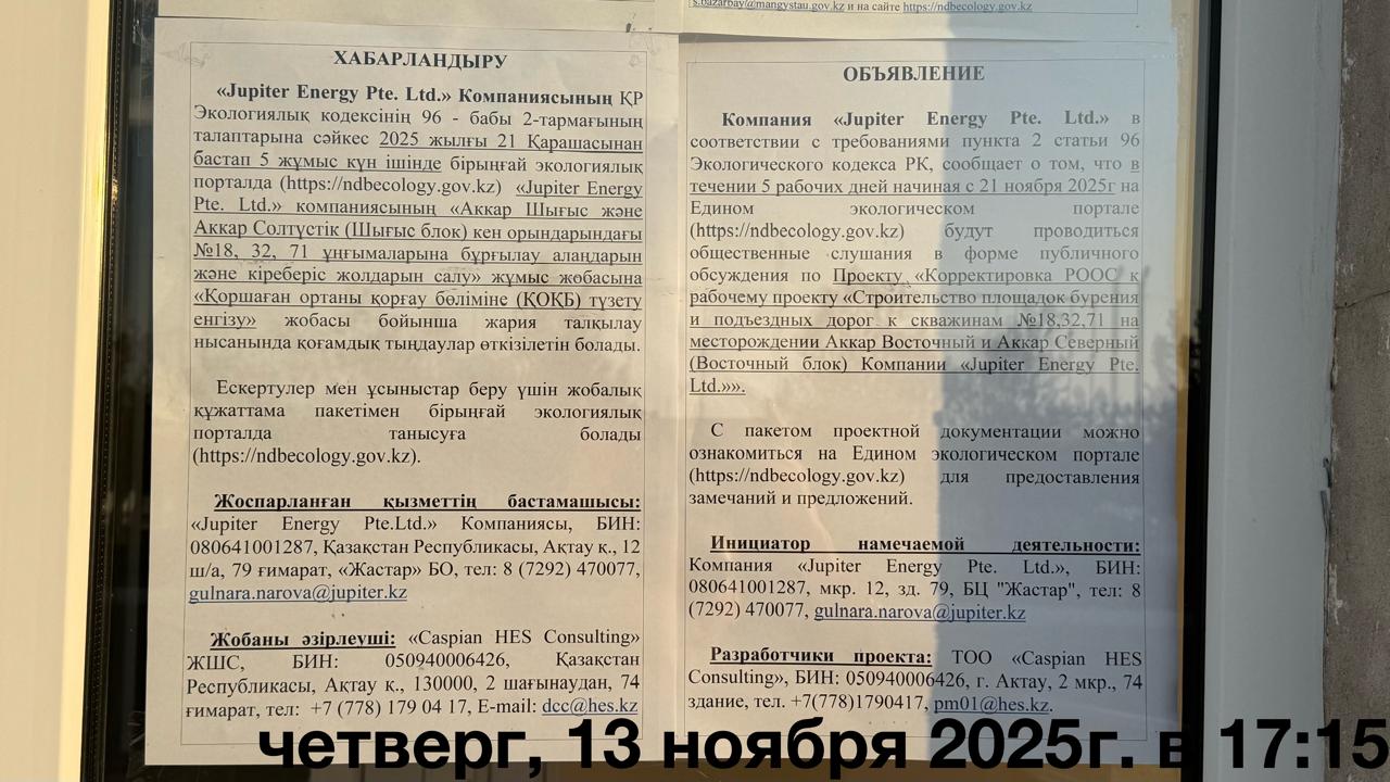 По проекту: Корректировка РООС к рабочему проекту «Строительство площадок бурения и подъездных дорог к скважинам №18,32,71 на месторождении Аккар Восточный и Аккар Северный (Восточный блок) Компании «Jupiter Energy Pte. Ltd.»