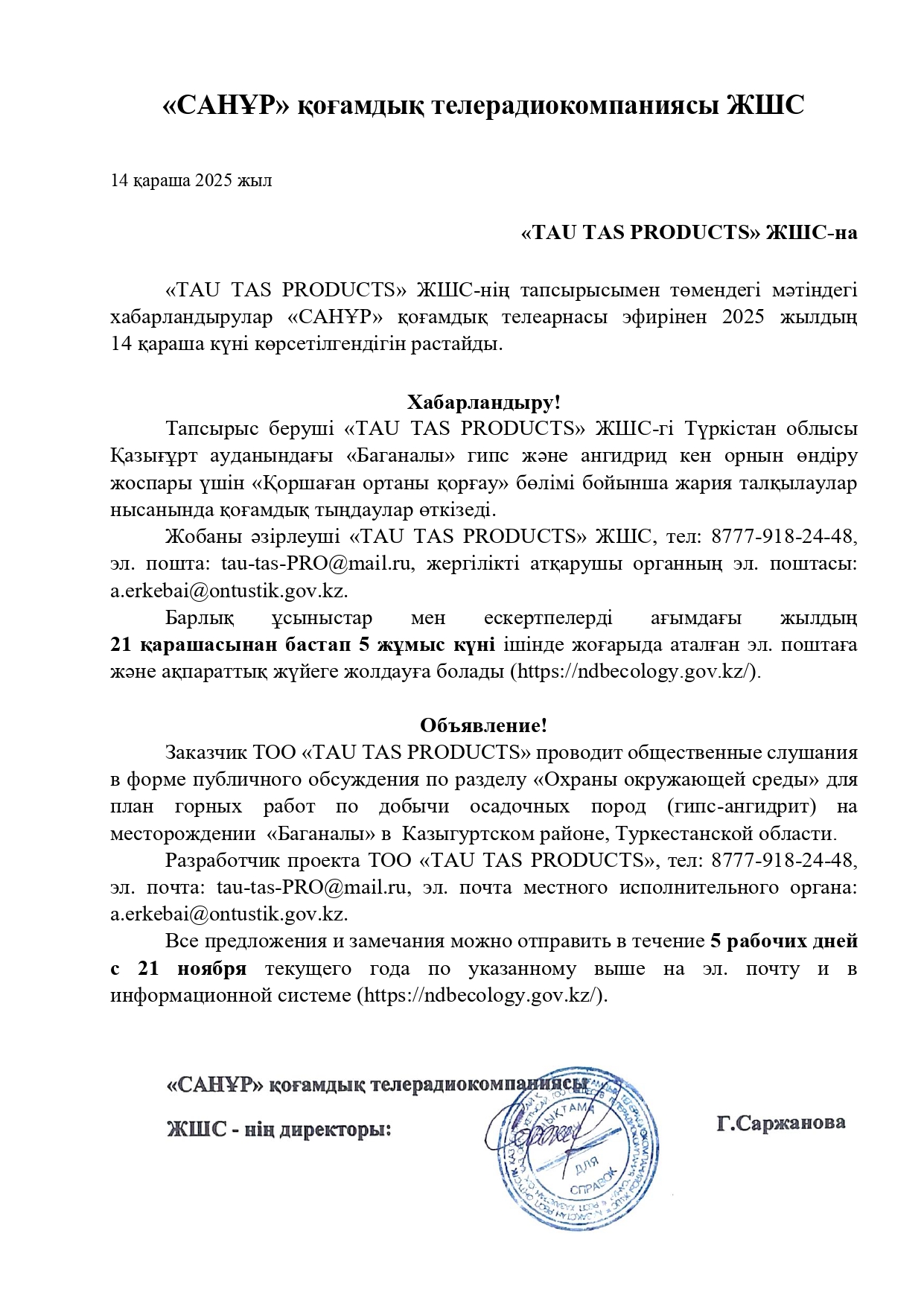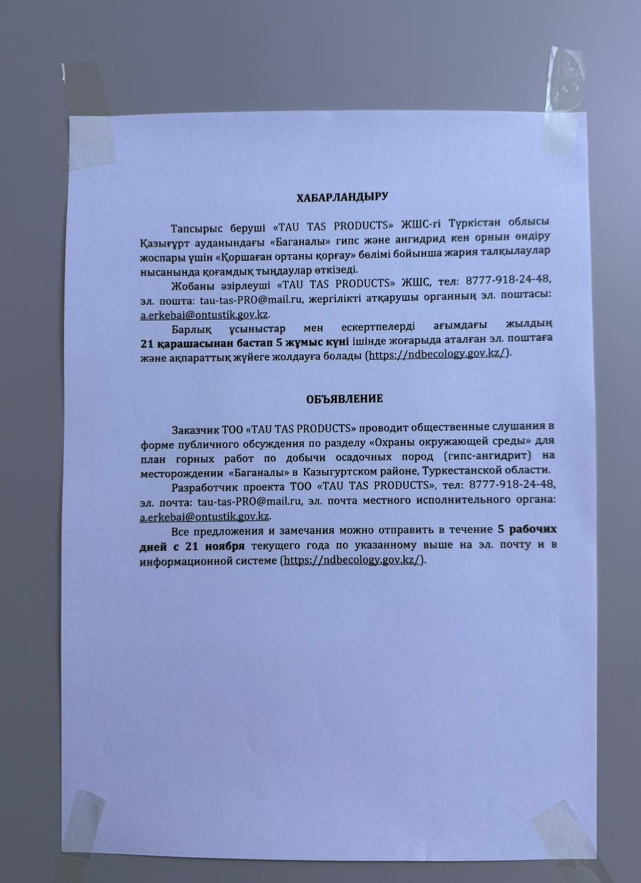 По проекту: РАЗДЕЛ «ОХРАНЫ ОКРУЖАЮЩЕЙ СРЕДЫ» для план горных работ по добычи осадочных пород (гипс-ангидрит) на месторождении «Баганалы» в Казыгуртском районе, Туркестанской области