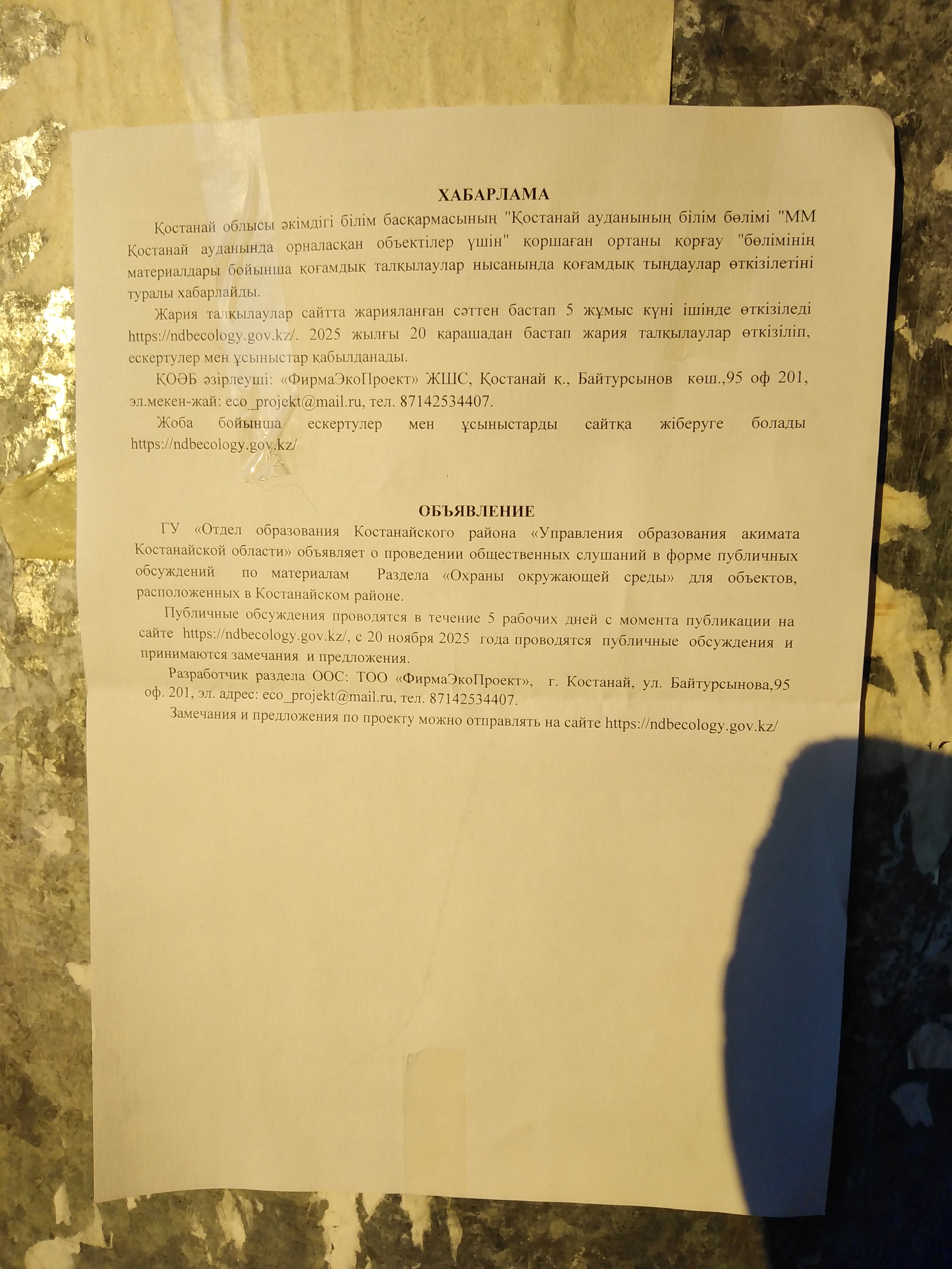 По проекту: Раздел «Охраны окружающей среды» для объектов, расположенных в Костанайском районе